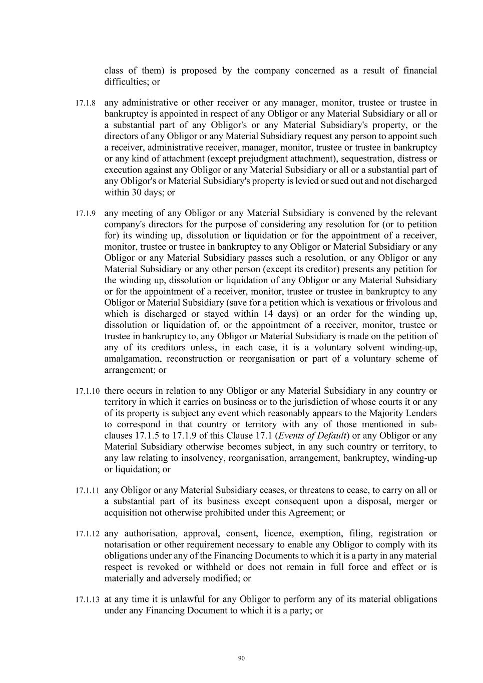 90 class of them) is proposed by the company concerned as a result of financial difficulties; or 17.1.8 any administrative or other receiver or any manager, monitor, trustee or trustee in bankruptcy is appointed in respect of any Obligor or any Material Subsidiary or all or a substantial part of any Obligor's or any Material Subsidiary's property, or the directors of any Obligor or any Material Subsidiary request any person to appoint such a receiver, administrative receiver, manager, monitor, trustee or trustee in bankruptcy or any kind of attachment (except prejudgment attachment), sequestration, distress or execution against any Obligor or any Material Subsidiary or all or a substantial part of any Obligor's or Material Subsidiary's property is levied or sued out and not discharged within 30 days; or 17.1.9 any meeting of any Obligor or any Material Subsidiary is convened by the relevant company's directors for the purpose of considering any resolution for (or to petition for) its winding up, dissolution or liquidation or for the appointment of a receiver, monitor, trustee or trustee in bankruptcy to any Obligor or Material Subsidiary or any Obligor or any Material Subsidiary passes such a resolution, or any Obligor or any Material Subsidiary or any other person (except its creditor) presents any petition for the winding up, dissolution or liquidation of any Obligor or any Material Subsidiary or for the appointment of a receiver, monitor, trustee or trustee in bankruptcy to any Obligor or Material Subsidiary (save for a petition which is vexatious or frivolous and which is discharged or stayed within 14 days) or an order for the winding up, dissolution or liquidation of, or the appointment of a receiver, monitor, trustee or trustee in bankruptcy to, any Obligor or Material Subsidiary is made on the petition of any of its creditors unless, in each case, it is a voluntary solvent winding-up, amalgamation, reconstruction or reorganisation or part of a voluntary scheme of arrangement; or 17.1.10 there occurs in relation to any Obligor or any Material Subsidiary in any country or territory in which it carries on business or to the jurisdiction of whose courts it or any of its property is subject any event which reasonably appears to the Majority Lenders to correspond in that country or territory with any of those mentioned in sub- clauses 17.1.5 to 17.1.9 of this Clause 17.1 (Events of Default) or any Obligor or any Material Subsidiary otherwise becomes subject, in any such country or territory, to any law relating to insolvency, reorganisation, arrangement, bankruptcy, winding-up or liquidation; or 17.1.11 any Obligor or any Material Subsidiary ceases, or threatens to cease, to carry on all or a substantial part of its business except consequent upon a disposal, merger or acquisition not otherwise prohibited under this Agreement; or 17.1.12 any authorisation, approval, consent, licence, exemption, filing, registration or notarisation or other requirement necessary to enable any Obligor to comply with its obligations under any of the Financing Documents to which it is a party in any material respect is revoked or withheld or does not remain in full force and effect or is materially and adversely modified; or 17.1.13 at any time it is unlawful for any Obligor to perform any of its material obligations under any Financing Document to which it is a party; or