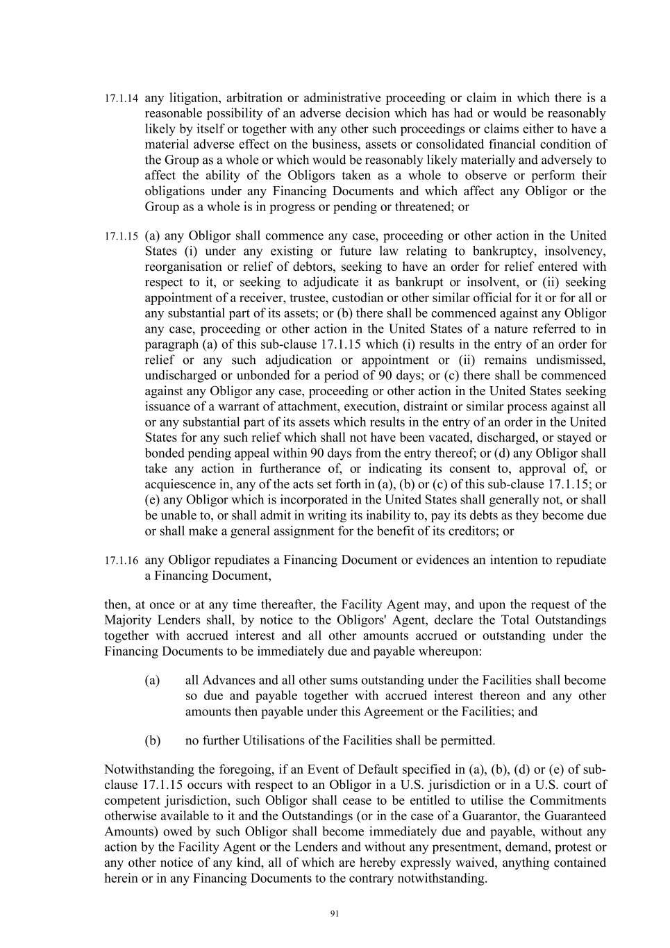 91 17.1.14 any litigation, arbitration or administrative proceeding or claim in which there is a reasonable possibility of an adverse decision which has had or would be reasonably likely by itself or together with any other such proceedings or claims either to have a material adverse effect on the business, assets or consolidated financial condition of the Group as a whole or which would be reasonably likely materially and adversely to affect the ability of the Obligors taken as a whole to observe or perform their obligations under any Financing Documents and which affect any Obligor or the Group as a whole is in progress or pending or threatened; or 17.1.15 (a) any Obligor shall commence any case, proceeding or other action in the United States (i) under any existing or future law relating to bankruptcy, insolvency, reorganisation or relief of debtors, seeking to have an order for relief entered with respect to it, or seeking to adjudicate it as bankrupt or insolvent, or (ii) seeking appointment of a receiver, trustee, custodian or other similar official for it or for all or any substantial part of its assets; or (b) there shall be commenced against any Obligor any case, proceeding or other action in the United States of a nature referred to in paragraph (a) of this sub-clause 17.1.15 which (i) results in the entry of an order for relief or any such adjudication or appointment or (ii) remains undismissed, undischarged or unbonded for a period of 90 days; or (c) there shall be commenced against any Obligor any case, proceeding or other action in the United States seeking issuance of a warrant of attachment, execution, distraint or similar process against all or any substantial part of its assets which results in the entry of an order in the United States for any such relief which shall not have been vacated, discharged, or stayed or bonded pending appeal within 90 days from the entry thereof; or (d) any Obligor shall take any action in furtherance of, or indicating its consent to, approval of, or acquiescence in, any of the acts set forth in (a), (b) or (c) of this sub-clause 17.1.15; or (e) any Obligor which is incorporated in the United States shall generally not, or shall be unable to, or shall admit in writing its inability to, pay its debts as they become due or shall make a general assignment for the benefit of its creditors; or 17.1.16 any Obligor repudiates a Financing Document or evidences an intention to repudiate a Financing Document, then, at once or at any time thereafter, the Facility Agent may, and upon the request of the Majority Lenders shall, by notice to the Obligors' Agent, declare the Total Outstandings together with accrued interest and all other amounts accrued or outstanding under the Financing Documents to be immediately due and payable whereupon: (a) all Advances and all other sums outstanding under the Facilities shall become so due and payable together with accrued interest thereon and any other amounts then payable under this Agreement or the Facilities; and (b) no further Utilisations of the Facilities shall be permitted. Notwithstanding the foregoing, if an Event of Default specified in (a), (b), (d) or (e) of sub- clause 17.1.15 occurs with respect to an Obligor in a U.S. jurisdiction or in a U.S. court of competent jurisdiction, such Obligor shall cease to be entitled to utilise the Commitments otherwise available to it and the Outstandings (or in the case of a Guarantor, the Guaranteed Amounts) owed by such Obligor shall become immediately due and payable, without any action by the Facility Agent or the Lenders and without any presentment, demand, protest or any other notice of any kind, all of which are hereby expressly waived, anything contained herein or in any Financing Documents to the contrary notwithstanding.