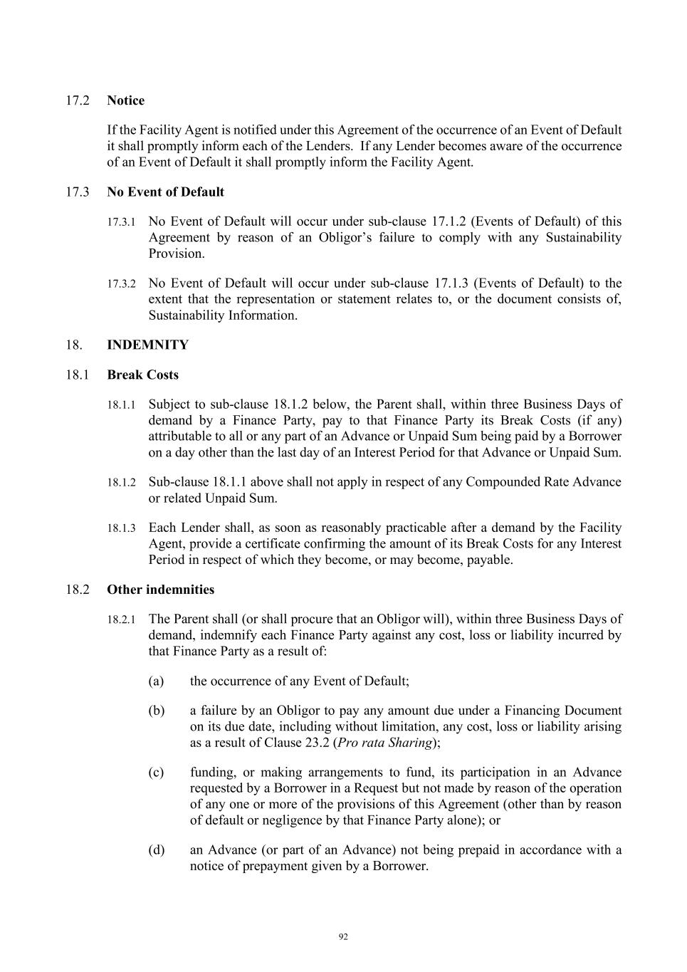 92 17.2 Notice If the Facility Agent is notified under this Agreement of the occurrence of an Event of Default it shall promptly inform each of the Lenders. If any Lender becomes aware of the occurrence of an Event of Default it shall promptly inform the Facility Agent. 17.3 No Event of Default 17.3.1 No Event of Default will occur under sub-clause 17.1.2 (Events of Default) of this Agreement by reason of an Obligor’s failure to comply with any Sustainability Provision. 17.3.2 No Event of Default will occur under sub-clause 17.1.3 (Events of Default) to the extent that the representation or statement relates to, or the document consists of, Sustainability Information. 18. INDEMNITY 18.1 Break Costs 18.1.1 Subject to sub-clause 18.1.2 below, the Parent shall, within three Business Days of demand by a Finance Party, pay to that Finance Party its Break Costs (if any) attributable to all or any part of an Advance or Unpaid Sum being paid by a Borrower on a day other than the last day of an Interest Period for that Advance or Unpaid Sum. 18.1.2 Sub-clause 18.1.1 above shall not apply in respect of any Compounded Rate Advance or related Unpaid Sum. 18.1.3 Each Lender shall, as soon as reasonably practicable after a demand by the Facility Agent, provide a certificate confirming the amount of its Break Costs for any Interest Period in respect of which they become, or may become, payable. 18.2 Other indemnities 18.2.1 The Parent shall (or shall procure that an Obligor will), within three Business Days of demand, indemnify each Finance Party against any cost, loss or liability incurred by that Finance Party as a result of: (a) the occurrence of any Event of Default; (b) a failure by an Obligor to pay any amount due under a Financing Document on its due date, including without limitation, any cost, loss or liability arising as a result of Clause 23.2 (Pro rata Sharing); (c) funding, or making arrangements to fund, its participation in an Advance requested by a Borrower in a Request but not made by reason of the operation of any one or more of the provisions of this Agreement (other than by reason of default or negligence by that Finance Party alone); or (d) an Advance (or part of an Advance) not being prepaid in accordance with a notice of prepayment given by a Borrower.