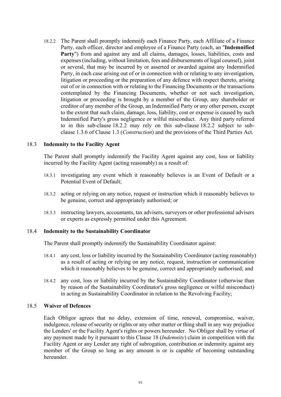 93 18.2.2 The Parent shall promptly indemnify each Finance Party, each Affiliate of a Finance Party, each officer, director and employee of a Finance Party (each, an "Indemnified Party") from and against any and all claims, damages, losses, liabilities, costs and expenses (including, without limitation, fees and disbursements of legal counsel), joint or several, that may be incurred by or asserted or awarded against any Indemnified Party, in each case arising out of or in connection with or relating to any investigation, litigation or proceeding or the preparation of any defence with respect thereto, arising out of or in connection with or relating to the Financing Documents or the transactions contemplated by the Financing Documents, whether or not such investigation, litigation or proceeding is brought by a member of the Group, any shareholder or creditor of any member of the Group, an Indemnified Party or any other person, except to the extent that such claim, damage, loss, liability, cost or expense is caused by such Indemnified Party's gross negligence or wilful misconduct. Any third party referred to in this sub-clause 18.2.2 may rely on this sub-clause 18.2.2 subject to sub- clause 1.3.6 of Clause 1.3 (Construction) and the provisions of the Third Parties Act. 18.3 Indemnity to the Facility Agent The Parent shall promptly indemnify the Facility Agent against any cost, loss or liability incurred by the Facility Agent (acting reasonably) as a result of: 18.3.1 investigating any event which it reasonably believes is an Event of Default or a Potential Event of Default; 18.3.2 acting or relying on any notice, request or instruction which it reasonably believes to be genuine, correct and appropriately authorised; or 18.3.3 instructing lawyers, accountants, tax advisers, surveyors or other professional advisers or experts as expressly permitted under this Agreement. 18.4 Indemnity to the Sustainability Coordinator The Parent shall promptly indemnify the Sustainability Coordinator against: 18.4.1 any cost, loss or liability incurred by the Sustainability Coordinator (acting reasonably) as a result of acting or relying on any notice, request, instruction or communication which it reasonably believes to be genuine, correct and appropriately authorised; and 18.4.2 any cost, loss or liability incurred by the Sustainability Coordinator (otherwise than by reason of the Sustainability Coordinator's gross negligence or wilful misconduct) in acting as Sustainability Coordinator in relation to the Revolving Facility; 18.5 Waiver of Defences Each Obligor agrees that no delay, extension of time, renewal, compromise, waiver, indulgence, release of security or rights or any other matter or thing shall in any way prejudice the Lenders' or the Facility Agent's rights or powers hereunder. No Obligor shall by virtue of any payment made by it pursuant to this Clause 18 (Indemnity) claim in competition with the Facility Agent or any Lender any right of subrogation, contribution or indemnity against any member of the Group so long as any amount is or is capable of becoming outstanding hereunder.