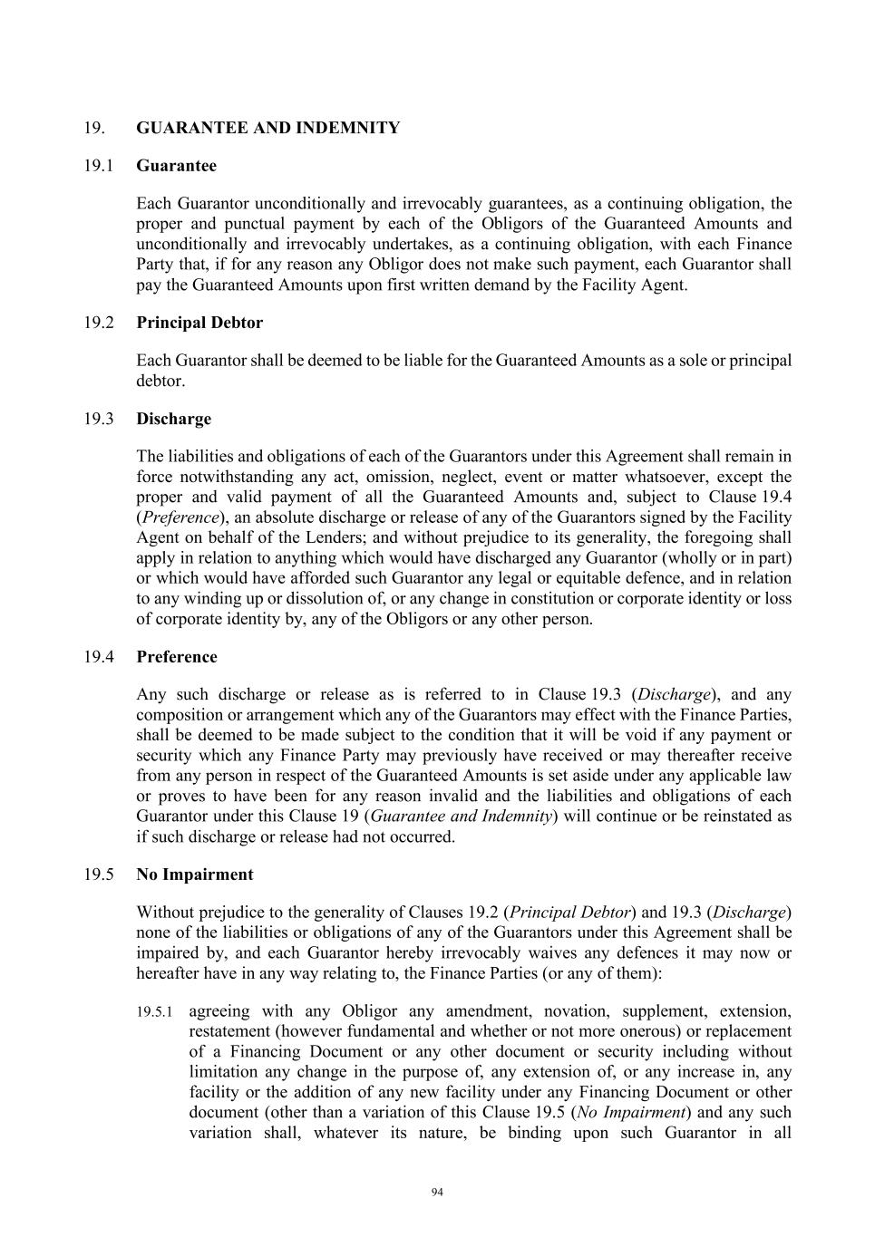 94 19. GUARANTEE AND INDEMNITY 19.1 Guarantee Each Guarantor unconditionally and irrevocably guarantees, as a continuing obligation, the proper and punctual payment by each of the Obligors of the Guaranteed Amounts and unconditionally and irrevocably undertakes, as a continuing obligation, with each Finance Party that, if for any reason any Obligor does not make such payment, each Guarantor shall pay the Guaranteed Amounts upon first written demand by the Facility Agent. 19.2 Principal Debtor Each Guarantor shall be deemed to be liable for the Guaranteed Amounts as a sole or principal debtor. 19.3 Discharge The liabilities and obligations of each of the Guarantors under this Agreement shall remain in force notwithstanding any act, omission, neglect, event or matter whatsoever, except the proper and valid payment of all the Guaranteed Amounts and, subject to Clause 19.4 (Preference), an absolute discharge or release of any of the Guarantors signed by the Facility Agent on behalf of the Lenders; and without prejudice to its generality, the foregoing shall apply in relation to anything which would have discharged any Guarantor (wholly or in part) or which would have afforded such Guarantor any legal or equitable defence, and in relation to any winding up or dissolution of, or any change in constitution or corporate identity or loss of corporate identity by, any of the Obligors or any other person. 19.4 Preference Any such discharge or release as is referred to in Clause 19.3 (Discharge), and any composition or arrangement which any of the Guarantors may effect with the Finance Parties, shall be deemed to be made subject to the condition that it will be void if any payment or security which any Finance Party may previously have received or may thereafter receive from any person in respect of the Guaranteed Amounts is set aside under any applicable law or proves to have been for any reason invalid and the liabilities and obligations of each Guarantor under this Clause 19 (Guarantee and Indemnity) will continue or be reinstated as if such discharge or release had not occurred. 19.5 No Impairment Without prejudice to the generality of Clauses 19.2 (Principal Debtor) and 19.3 (Discharge) none of the liabilities or obligations of any of the Guarantors under this Agreement shall be impaired by, and each Guarantor hereby irrevocably waives any defences it may now or hereafter have in any way relating to, the Finance Parties (or any of them): 19.5.1 agreeing with any Obligor any amendment, novation, supplement, extension, restatement (however fundamental and whether or not more onerous) or replacement of a Financing Document or any other document or security including without limitation any change in the purpose of, any extension of, or any increase in, any facility or the addition of any new facility under any Financing Document or other document (other than a variation of this Clause 19.5 (No Impairment) and any such variation shall, whatever its nature, be binding upon such Guarantor in all