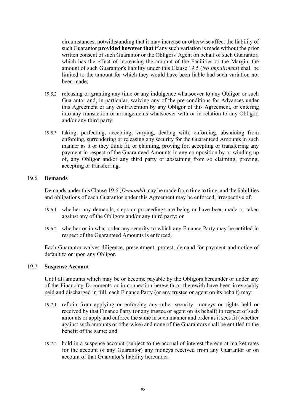 95 circumstances, notwithstanding that it may increase or otherwise affect the liability of such Guarantor provided however that if any such variation is made without the prior written consent of such Guarantor or the Obligors' Agent on behalf of such Guarantor, which has the effect of increasing the amount of the Facilities or the Margin, the amount of such Guarantor's liability under this Clause 19.5 (No Impairment) shall be limited to the amount for which they would have been liable had such variation not been made; 19.5.2 releasing or granting any time or any indulgence whatsoever to any Obligor or such Guarantor and, in particular, waiving any of the pre-conditions for Advances under this Agreement or any contravention by any Obligor of this Agreement, or entering into any transaction or arrangements whatsoever with or in relation to any Obligor, and/or any third party; 19.5.3 taking, perfecting, accepting, varying, dealing with, enforcing, abstaining from enforcing, surrendering or releasing any security for the Guaranteed Amounts in such manner as it or they think fit, or claiming, proving for, accepting or transferring any payment in respect of the Guaranteed Amounts in any composition by or winding up of, any Obligor and/or any third party or abstaining from so claiming, proving, accepting or transferring. 19.6 Demands Demands under this Clause 19.6 (Demands) may be made from time to time, and the liabilities and obligations of each Guarantor under this Agreement may be enforced, irrespective of: 19.6.1 whether any demands, steps or proceedings are being or have been made or taken against any of the Obligors and/or any third party; or 19.6.2 whether or in what order any security to which any Finance Party may be entitled in respect of the Guaranteed Amounts is enforced. Each Guarantor waives diligence, presentment, protest, demand for payment and notice of default to or upon any Obligor. 19.7 Suspense Account Until all amounts which may be or become payable by the Obligors hereunder or under any of the Financing Documents or in connection herewith or therewith have been irrevocably paid and discharged in full, each Finance Party (or any trustee or agent on its behalf) may: 19.7.1 refrain from applying or enforcing any other security, moneys or rights held or received by that Finance Party (or any trustee or agent on its behalf) in respect of such amounts or apply and enforce the same in such manner and order as it sees fit (whether against such amounts or otherwise) and none of the Guarantors shall be entitled to the benefit of the same; and 19.7.2 hold in a suspense account (subject to the accrual of interest thereon at market rates for the account of any Guarantor) any moneys received from any Guarantor or on account of that Guarantor's liability hereunder.