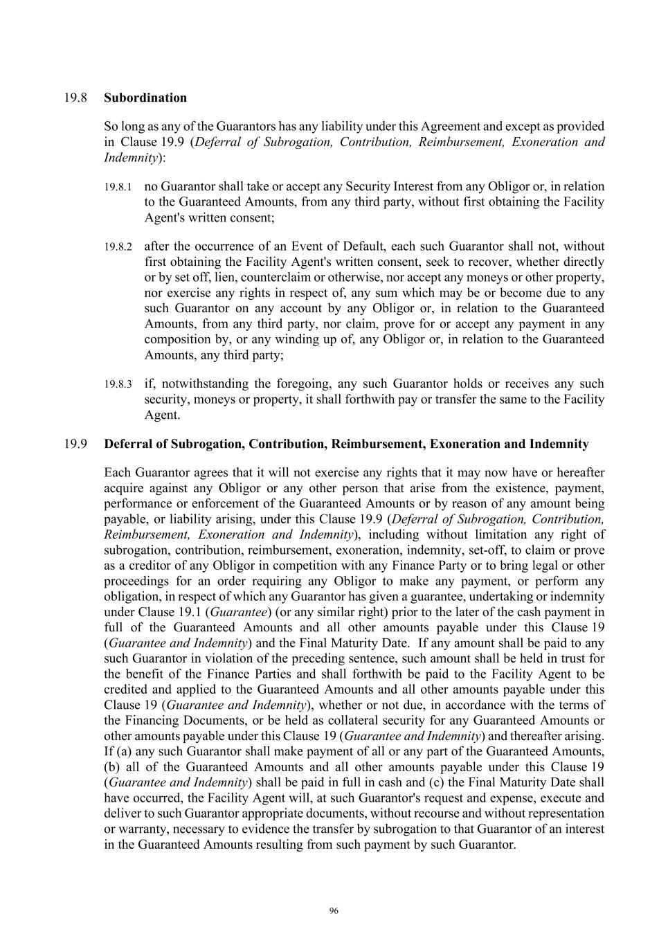 96 19.8 Subordination So long as any of the Guarantors has any liability under this Agreement and except as provided in Clause 19.9 (Deferral of Subrogation, Contribution, Reimbursement, Exoneration and Indemnity): 19.8.1 no Guarantor shall take or accept any Security Interest from any Obligor or, in relation to the Guaranteed Amounts, from any third party, without first obtaining the Facility Agent's written consent; 19.8.2 after the occurrence of an Event of Default, each such Guarantor shall not, without first obtaining the Facility Agent's written consent, seek to recover, whether directly or by set off, lien, counterclaim or otherwise, nor accept any moneys or other property, nor exercise any rights in respect of, any sum which may be or become due to any such Guarantor on any account by any Obligor or, in relation to the Guaranteed Amounts, from any third party, nor claim, prove for or accept any payment in any composition by, or any winding up of, any Obligor or, in relation to the Guaranteed Amounts, any third party; 19.8.3 if, notwithstanding the foregoing, any such Guarantor holds or receives any such security, moneys or property, it shall forthwith pay or transfer the same to the Facility Agent. 19.9 Deferral of Subrogation, Contribution, Reimbursement, Exoneration and Indemnity Each Guarantor agrees that it will not exercise any rights that it may now have or hereafter acquire against any Obligor or any other person that arise from the existence, payment, performance or enforcement of the Guaranteed Amounts or by reason of any amount being payable, or liability arising, under this Clause 19.9 (Deferral of Subrogation, Contribution, Reimbursement, Exoneration and Indemnity), including without limitation any right of subrogation, contribution, reimbursement, exoneration, indemnity, set-off, to claim or prove as a creditor of any Obligor in competition with any Finance Party or to bring legal or other proceedings for an order requiring any Obligor to make any payment, or perform any obligation, in respect of which any Guarantor has given a guarantee, undertaking or indemnity under Clause 19.1 (Guarantee) (or any similar right) prior to the later of the cash payment in full of the Guaranteed Amounts and all other amounts payable under this Clause 19 (Guarantee and Indemnity) and the Final Maturity Date. If any amount shall be paid to any such Guarantor in violation of the preceding sentence, such amount shall be held in trust for the benefit of the Finance Parties and shall forthwith be paid to the Facility Agent to be credited and applied to the Guaranteed Amounts and all other amounts payable under this Clause 19 (Guarantee and Indemnity), whether or not due, in accordance with the terms of the Financing Documents, or be held as collateral security for any Guaranteed Amounts or other amounts payable under this Clause 19 (Guarantee and Indemnity) and thereafter arising. If (a) any such Guarantor shall make payment of all or any part of the Guaranteed Amounts, (b) all of the Guaranteed Amounts and all other amounts payable under this Clause 19 (Guarantee and Indemnity) shall be paid in full in cash and (c) the Final Maturity Date shall have occurred, the Facility Agent will, at such Guarantor's request and expense, execute and deliver to such Guarantor appropriate documents, without recourse and without representation or warranty, necessary to evidence the transfer by subrogation to that Guarantor of an interest in the Guaranteed Amounts resulting from such payment by such Guarantor.