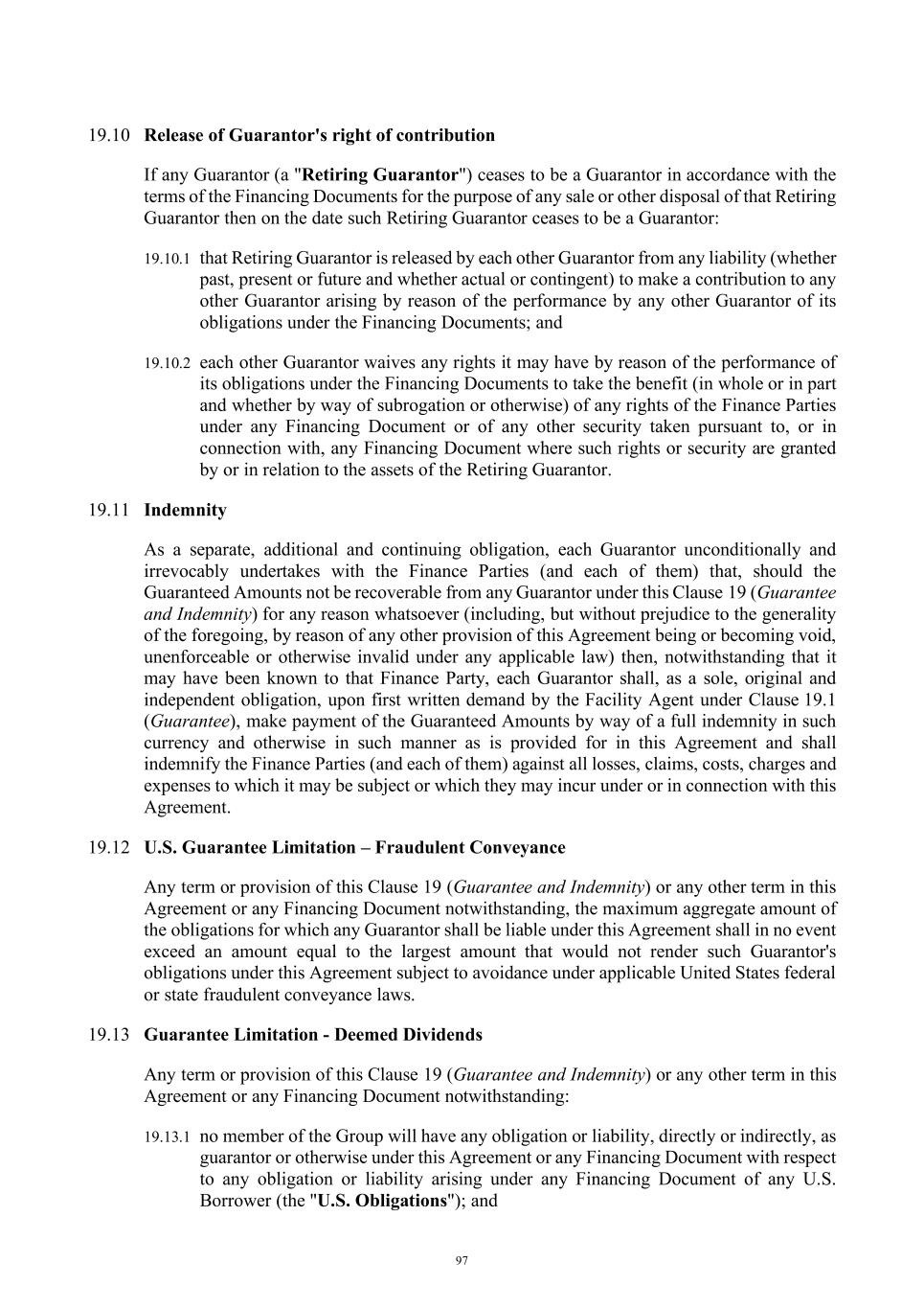 97 19.10 Release of Guarantor's right of contribution If any Guarantor (a "Retiring Guarantor") ceases to be a Guarantor in accordance with the terms of the Financing Documents for the purpose of any sale or other disposal of that Retiring Guarantor then on the date such Retiring Guarantor ceases to be a Guarantor: 19.10.1 that Retiring Guarantor is released by each other Guarantor from any liability (whether past, present or future and whether actual or contingent) to make a contribution to any other Guarantor arising by reason of the performance by any other Guarantor of its obligations under the Financing Documents; and 19.10.2 each other Guarantor waives any rights it may have by reason of the performance of its obligations under the Financing Documents to take the benefit (in whole or in part and whether by way of subrogation or otherwise) of any rights of the Finance Parties under any Financing Document or of any other security taken pursuant to, or in connection with, any Financing Document where such rights or security are granted by or in relation to the assets of the Retiring Guarantor. 19.11 Indemnity As a separate, additional and continuing obligation, each Guarantor unconditionally and irrevocably undertakes with the Finance Parties (and each of them) that, should the Guaranteed Amounts not be recoverable from any Guarantor under this Clause 19 (Guarantee and Indemnity) for any reason whatsoever (including, but without prejudice to the generality of the foregoing, by reason of any other provision of this Agreement being or becoming void, unenforceable or otherwise invalid under any applicable law) then, notwithstanding that it may have been known to that Finance Party, each Guarantor shall, as a sole, original and independent obligation, upon first written demand by the Facility Agent under Clause 19.1 (Guarantee), make payment of the Guaranteed Amounts by way of a full indemnity in such currency and otherwise in such manner as is provided for in this Agreement and shall indemnify the Finance Parties (and each of them) against all losses, claims, costs, charges and expenses to which it may be subject or which they may incur under or in connection with this Agreement. 19.12 U.S. Guarantee Limitation – Fraudulent Conveyance Any term or provision of this Clause 19 (Guarantee and Indemnity) or any other term in this Agreement or any Financing Document notwithstanding, the maximum aggregate amount of the obligations for which any Guarantor shall be liable under this Agreement shall in no event exceed an amount equal to the largest amount that would not render such Guarantor's obligations under this Agreement subject to avoidance under applicable United States federal or state fraudulent conveyance laws. 19.13 Guarantee Limitation - Deemed Dividends Any term or provision of this Clause 19 (Guarantee and Indemnity) or any other term in this Agreement or any Financing Document notwithstanding: 19.13.1 no member of the Group will have any obligation or liability, directly or indirectly, as guarantor or otherwise under this Agreement or any Financing Document with respect to any obligation or liability arising under any Financing Document of any U.S. Borrower (the "U.S. Obligations"); and
