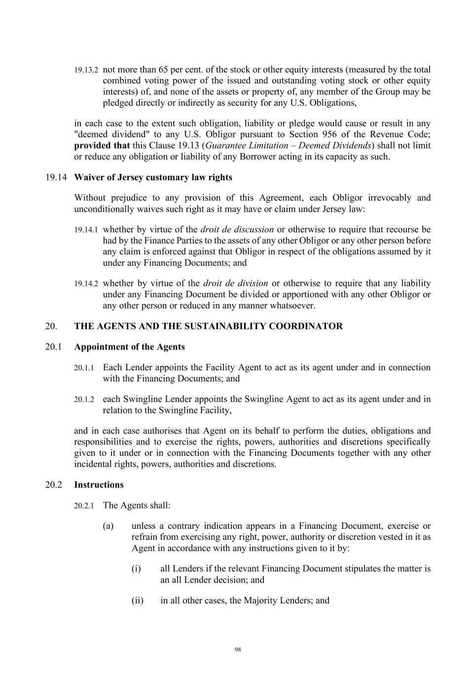 98 19.13.2 not more than 65 per cent. of the stock or other equity interests (measured by the total combined voting power of the issued and outstanding voting stock or other equity interests) of, and none of the assets or property of, any member of the Group may be pledged directly or indirectly as security for any U.S. Obligations, in each case to the extent such obligation, liability or pledge would cause or result in any "deemed dividend" to any U.S. Obligor pursuant to Section 956 of the Revenue Code; provided that this Clause 19.13 (Guarantee Limitation – Deemed Dividends) shall not limit or reduce any obligation or liability of any Borrower acting in its capacity as such. 19.14 Waiver of Jersey customary law rights Without prejudice to any provision of this Agreement, each Obligor irrevocably and unconditionally waives such right as it may have or claim under Jersey law: 19.14.1 whether by virtue of the droit de discussion or otherwise to require that recourse be had by the Finance Parties to the assets of any other Obligor or any other person before any claim is enforced against that Obligor in respect of the obligations assumed by it under any Financing Documents; and 19.14.2 whether by virtue of the droit de division or otherwise to require that any liability under any Financing Document be divided or apportioned with any other Obligor or any other person or reduced in any manner whatsoever. 20. THE AGENTS AND THE SUSTAINABILITY COORDINATOR 20.1 Appointment of the Agents 20.1.1 Each Lender appoints the Facility Agent to act as its agent under and in connection with the Financing Documents; and 20.1.2 each Swingline Lender appoints the Swingline Agent to act as its agent under and in relation to the Swingline Facility, and in each case authorises that Agent on its behalf to perform the duties, obligations and responsibilities and to exercise the rights, powers, authorities and discretions specifically given to it under or in connection with the Financing Documents together with any other incidental rights, powers, authorities and discretions. 20.2 Instructions 20.2.1 The Agents shall: (a) unless a contrary indication appears in a Financing Document, exercise or refrain from exercising any right, power, authority or discretion vested in it as Agent in accordance with any instructions given to it by: (i) all Lenders if the relevant Financing Document stipulates the matter is an all Lender decision; and (ii) in all other cases, the Majority Lenders; and