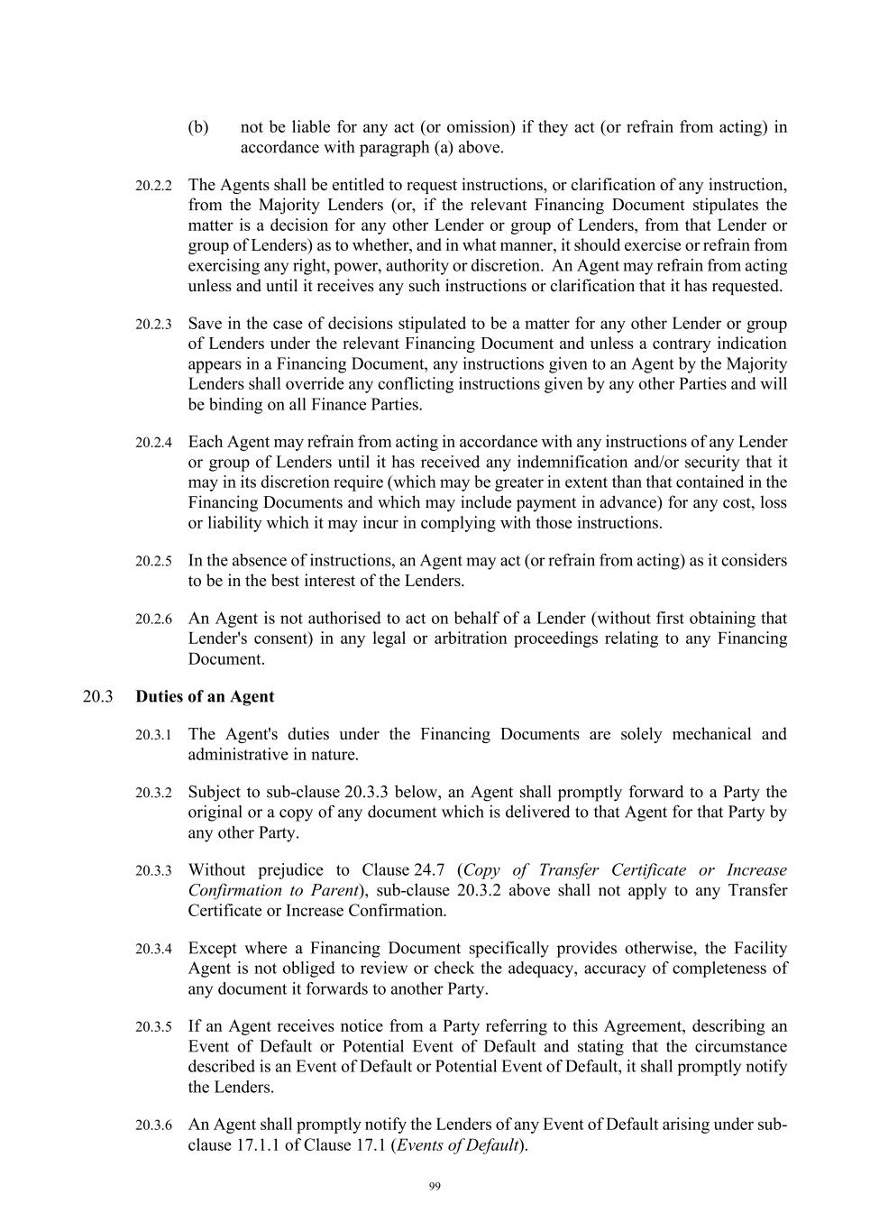 99 (b) not be liable for any act (or omission) if they act (or refrain from acting) in accordance with paragraph (a) above. 20.2.2 The Agents shall be entitled to request instructions, or clarification of any instruction, from the Majority Lenders (or, if the relevant Financing Document stipulates the matter is a decision for any other Lender or group of Lenders, from that Lender or group of Lenders) as to whether, and in what manner, it should exercise or refrain from exercising any right, power, authority or discretion. An Agent may refrain from acting unless and until it receives any such instructions or clarification that it has requested. 20.2.3 Save in the case of decisions stipulated to be a matter for any other Lender or group of Lenders under the relevant Financing Document and unless a contrary indication appears in a Financing Document, any instructions given to an Agent by the Majority Lenders shall override any conflicting instructions given by any other Parties and will be binding on all Finance Parties. 20.2.4 Each Agent may refrain from acting in accordance with any instructions of any Lender or group of Lenders until it has received any indemnification and/or security that it may in its discretion require (which may be greater in extent than that contained in the Financing Documents and which may include payment in advance) for any cost, loss or liability which it may incur in complying with those instructions. 20.2.5 In the absence of instructions, an Agent may act (or refrain from acting) as it considers to be in the best interest of the Lenders. 20.2.6 An Agent is not authorised to act on behalf of a Lender (without first obtaining that Lender's consent) in any legal or arbitration proceedings relating to any Financing Document. 20.3 Duties of an Agent 20.3.1 The Agent's duties under the Financing Documents are solely mechanical and administrative in nature. 20.3.2 Subject to sub-clause 20.3.3 below, an Agent shall promptly forward to a Party the original or a copy of any document which is delivered to that Agent for that Party by any other Party. 20.3.3 Without prejudice to Clause 24.7 (Copy of Transfer Certificate or Increase Confirmation to Parent), sub-clause 20.3.2 above shall not apply to any Transfer Certificate or Increase Confirmation. 20.3.4 Except where a Financing Document specifically provides otherwise, the Facility Agent is not obliged to review or check the adequacy, accuracy of completeness of any document it forwards to another Party. 20.3.5 If an Agent receives notice from a Party referring to this Agreement, describing an Event of Default or Potential Event of Default and stating that the circumstance described is an Event of Default or Potential Event of Default, it shall promptly notify the Lenders. 20.3.6 An Agent shall promptly notify the Lenders of any Event of Default arising under sub- clause 17.1.1 of Clause 17.1 (Events of Default).