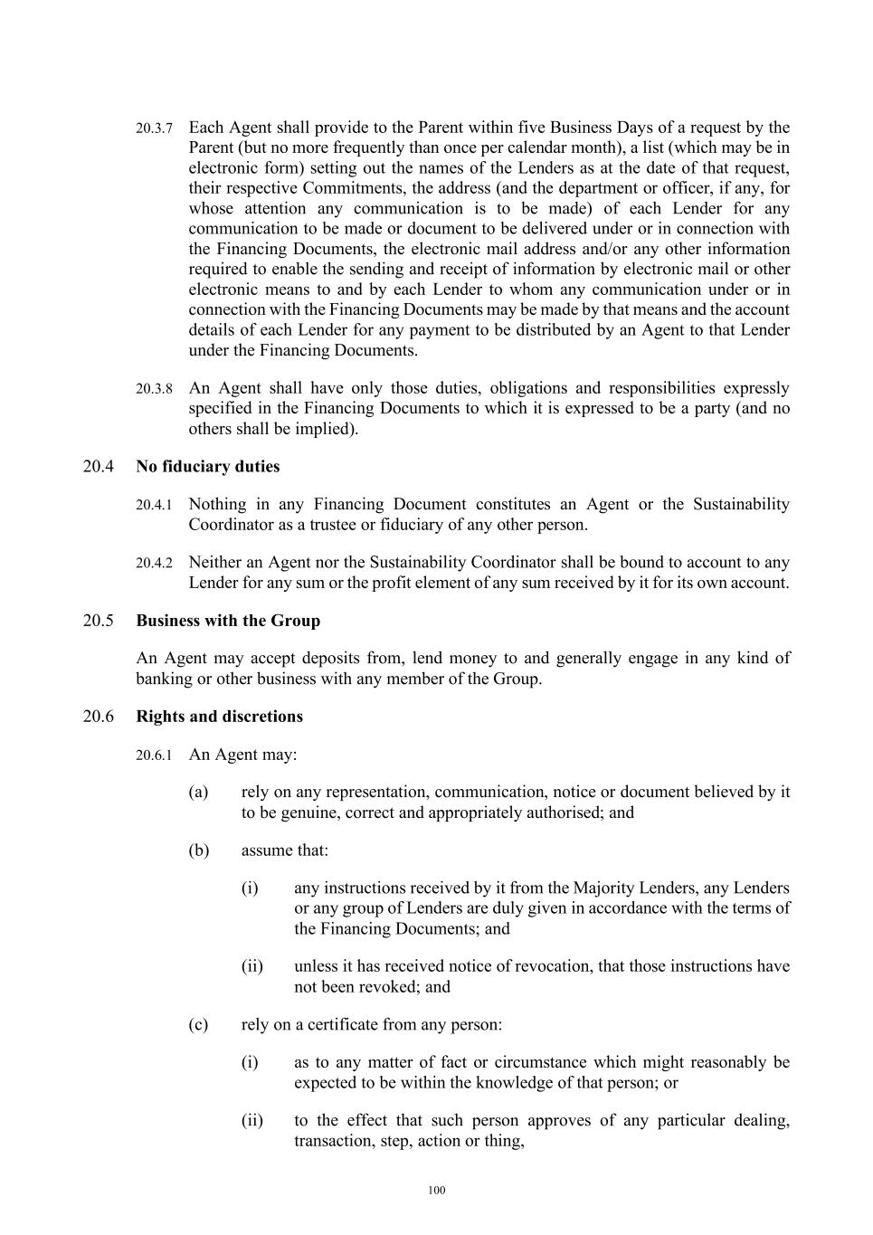 100 20.3.7 Each Agent shall provide to the Parent within five Business Days of a request by the Parent (but no more frequently than once per calendar month), a list (which may be in electronic form) setting out the names of the Lenders as at the date of that request, their respective Commitments, the address (and the department or officer, if any, for whose attention any communication is to be made) of each Lender for any communication to be made or document to be delivered under or in connection with the Financing Documents, the electronic mail address and/or any other information required to enable the sending and receipt of information by electronic mail or other electronic means to and by each Lender to whom any communication under or in connection with the Financing Documents may be made by that means and the account details of each Lender for any payment to be distributed by an Agent to that Lender under the Financing Documents. 20.3.8 An Agent shall have only those duties, obligations and responsibilities expressly specified in the Financing Documents to which it is expressed to be a party (and no others shall be implied). 20.4 No fiduciary duties 20.4.1 Nothing in any Financing Document constitutes an Agent or the Sustainability Coordinator as a trustee or fiduciary of any other person. 20.4.2 Neither an Agent nor the Sustainability Coordinator shall be bound to account to any Lender for any sum or the profit element of any sum received by it for its own account. 20.5 Business with the Group An Agent may accept deposits from, lend money to and generally engage in any kind of banking or other business with any member of the Group. 20.6 Rights and discretions 20.6.1 An Agent may: (a) rely on any representation, communication, notice or document believed by it to be genuine, correct and appropriately authorised; and (b) assume that: (i) any instructions received by it from the Majority Lenders, any Lenders or any group of Lenders are duly given in accordance with the terms of the Financing Documents; and (ii) unless it has received notice of revocation, that those instructions have not been revoked; and (c) rely on a certificate from any person: (i) as to any matter of fact or circumstance which might reasonably be expected to be within the knowledge of that person; or (ii) to the effect that such person approves of any particular dealing, transaction, step, action or thing,