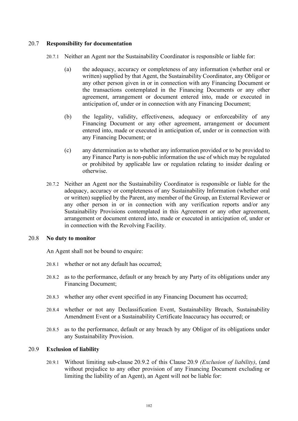 102 20.7 Responsibility for documentation 20.7.1 Neither an Agent nor the Sustainability Coordinator is responsible or liable for: (a) the adequacy, accuracy or completeness of any information (whether oral or written) supplied by that Agent, the Sustainability Coordinator, any Obligor or any other person given in or in connection with any Financing Document or the transactions contemplated in the Financing Documents or any other agreement, arrangement or document entered into, made or executed in anticipation of, under or in connection with any Financing Document; (b) the legality, validity, effectiveness, adequacy or enforceability of any Financing Document or any other agreement, arrangement or document entered into, made or executed in anticipation of, under or in connection with any Financing Document; or (c) any determination as to whether any information provided or to be provided to any Finance Party is non-public information the use of which may be regulated or prohibited by applicable law or regulation relating to insider dealing or otherwise. 20.7.2 Neither an Agent nor the Sustainability Coordinator is responsible or liable for the adequacy, accuracy or completeness of any Sustainability Information (whether oral or written) supplied by the Parent, any member of the Group, an External Reviewer or any other person in or in connection with any verification reports and/or any Sustainability Provisions contemplated in this Agreement or any other agreement, arrangement or document entered into, made or executed in anticipation of, under or in connection with the Revolving Facility. 20.8 No duty to monitor An Agent shall not be bound to enquire: 20.8.1 whether or not any default has occurred; 20.8.2 as to the performance, default or any breach by any Party of its obligations under any Financing Document; 20.8.3 whether any other event specified in any Financing Document has occurred; 20.8.4 whether or not any Declassification Event, Sustainability Breach, Sustainability Amendment Event or a Sustainability Certificate Inaccuracy has occurred; or 20.8.5 as to the performance, default or any breach by any Obligor of its obligations under any Sustainability Provision. 20.9 Exclusion of liability 20.9.1 Without limiting sub-clause 20.9.2 of this Clause 20.9 (Exclusion of liability), (and without prejudice to any other provision of any Financing Document excluding or limiting the liability of an Agent), an Agent will not be liable for: