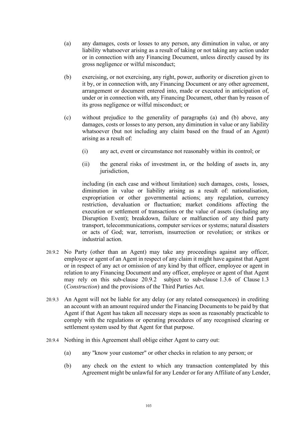 103 (a) any damages, costs or losses to any person, any diminution in value, or any liability whatsoever arising as a result of taking or not taking any action under or in connection with any Financing Document, unless directly caused by its gross negligence or wilful misconduct; (b) exercising, or not exercising, any right, power, authority or discretion given to it by, or in connection with, any Financing Document or any other agreement, arrangement or document entered into, made or executed in anticipation of, under or in connection with, any Financing Document, other than by reason of its gross negligence or wilful misconduct; or (c) without prejudice to the generality of paragraphs (a) and (b) above, any damages, costs or losses to any person, any diminution in value or any liability whatsoever (but not including any claim based on the fraud of an Agent) arising as a result of: (i) any act, event or circumstance not reasonably within its control; or (ii) the general risks of investment in, or the holding of assets in, any jurisdiction, including (in each case and without limitation) such damages, costs, losses, diminution in value or liability arising as a result of: nationalisation, expropriation or other governmental actions; any regulation, currency restriction, devaluation or fluctuation; market conditions affecting the execution or settlement of transactions or the value of assets (including any Disruption Event); breakdown, failure or malfunction of any third party transport, telecommunications, computer services or systems; natural disasters or acts of God; war, terrorism, insurrection or revolution; or strikes or industrial action. 20.9.2 No Party (other than an Agent) may take any proceedings against any officer, employee or agent of an Agent in respect of any claim it might have against that Agent or in respect of any act or omission of any kind by that officer, employee or agent in relation to any Financing Document and any officer, employee or agent of that Agent may rely on this sub-clause 20.9.2 subject to sub-clause 1.3.6 of Clause 1.3 (Construction) and the provisions of the Third Parties Act. 20.9.3 An Agent will not be liable for any delay (or any related consequences) in crediting an account with an amount required under the Financing Documents to be paid by that Agent if that Agent has taken all necessary steps as soon as reasonably practicable to comply with the regulations or operating procedures of any recognised clearing or settlement system used by that Agent for that purpose. 20.9.4 Nothing in this Agreement shall oblige either Agent to carry out: (a) any "know your customer" or other checks in relation to any person; or (b) any check on the extent to which any transaction contemplated by this Agreement might be unlawful for any Lender or for any Affiliate of any Lender,