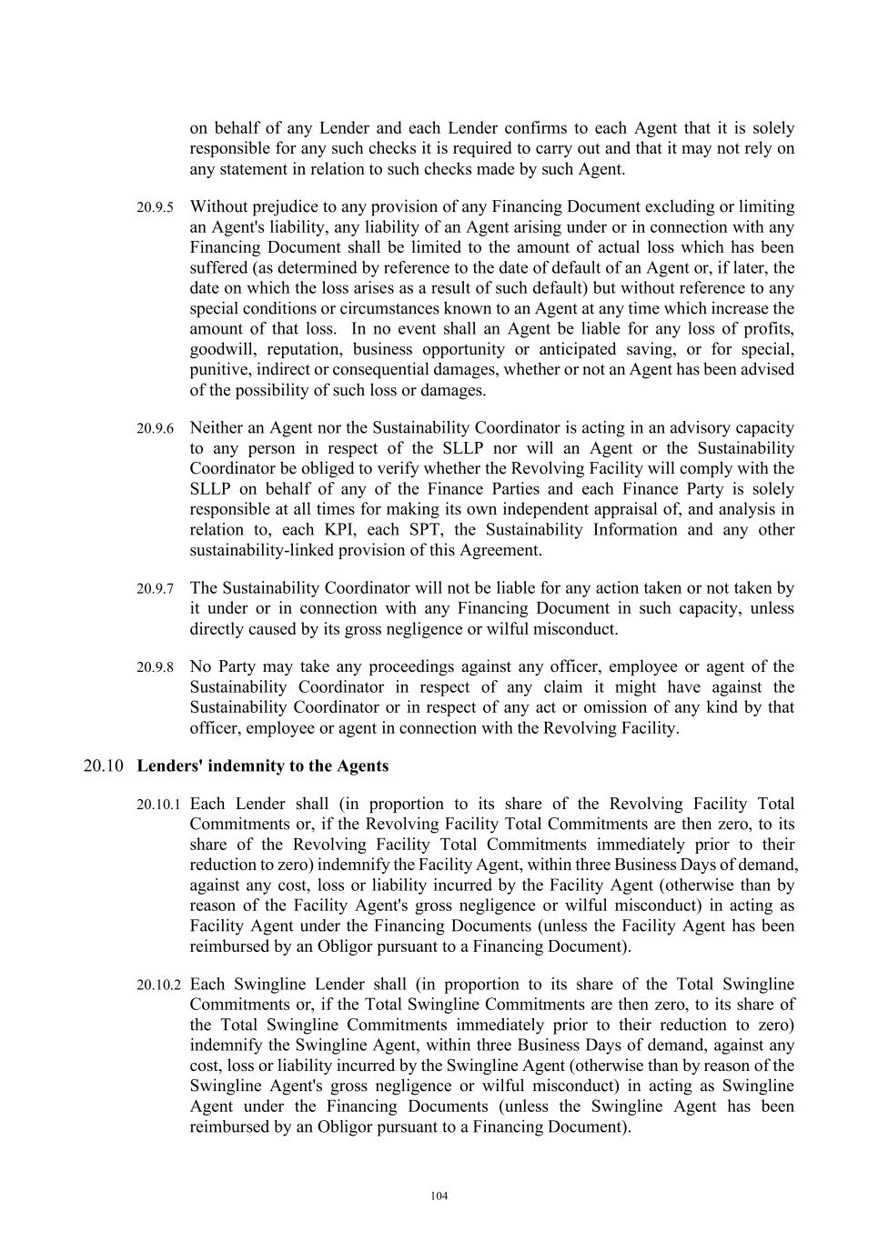 104 on behalf of any Lender and each Lender confirms to each Agent that it is solely responsible for any such checks it is required to carry out and that it may not rely on any statement in relation to such checks made by such Agent. 20.9.5 Without prejudice to any provision of any Financing Document excluding or limiting an Agent's liability, any liability of an Agent arising under or in connection with any Financing Document shall be limited to the amount of actual loss which has been suffered (as determined by reference to the date of default of an Agent or, if later, the date on which the loss arises as a result of such default) but without reference to any special conditions or circumstances known to an Agent at any time which increase the amount of that loss. In no event shall an Agent be liable for any loss of profits, goodwill, reputation, business opportunity or anticipated saving, or for special, punitive, indirect or consequential damages, whether or not an Agent has been advised of the possibility of such loss or damages. 20.9.6 Neither an Agent nor the Sustainability Coordinator is acting in an advisory capacity to any person in respect of the SLLP nor will an Agent or the Sustainability Coordinator be obliged to verify whether the Revolving Facility will comply with the SLLP on behalf of any of the Finance Parties and each Finance Party is solely responsible at all times for making its own independent appraisal of, and analysis in relation to, each KPI, each SPT, the Sustainability Information and any other sustainability-linked provision of this Agreement. 20.9.7 The Sustainability Coordinator will not be liable for any action taken or not taken by it under or in connection with any Financing Document in such capacity, unless directly caused by its gross negligence or wilful misconduct. 20.9.8 No Party may take any proceedings against any officer, employee or agent of the Sustainability Coordinator in respect of any claim it might have against the Sustainability Coordinator or in respect of any act or omission of any kind by that officer, employee or agent in connection with the Revolving Facility. 20.10 Lenders' indemnity to the Agents 20.10.1 Each Lender shall (in proportion to its share of the Revolving Facility Total Commitments or, if the Revolving Facility Total Commitments are then zero, to its share of the Revolving Facility Total Commitments immediately prior to their reduction to zero) indemnify the Facility Agent, within three Business Days of demand, against any cost, loss or liability incurred by the Facility Agent (otherwise than by reason of the Facility Agent's gross negligence or wilful misconduct) in acting as Facility Agent under the Financing Documents (unless the Facility Agent has been reimbursed by an Obligor pursuant to a Financing Document). 20.10.2 Each Swingline Lender shall (in proportion to its share of the Total Swingline Commitments or, if the Total Swingline Commitments are then zero, to its share of the Total Swingline Commitments immediately prior to their reduction to zero) indemnify the Swingline Agent, within three Business Days of demand, against any cost, loss or liability incurred by the Swingline Agent (otherwise than by reason of the Swingline Agent's gross negligence or wilful misconduct) in acting as Swingline Agent under the Financing Documents (unless the Swingline Agent has been reimbursed by an Obligor pursuant to a Financing Document).