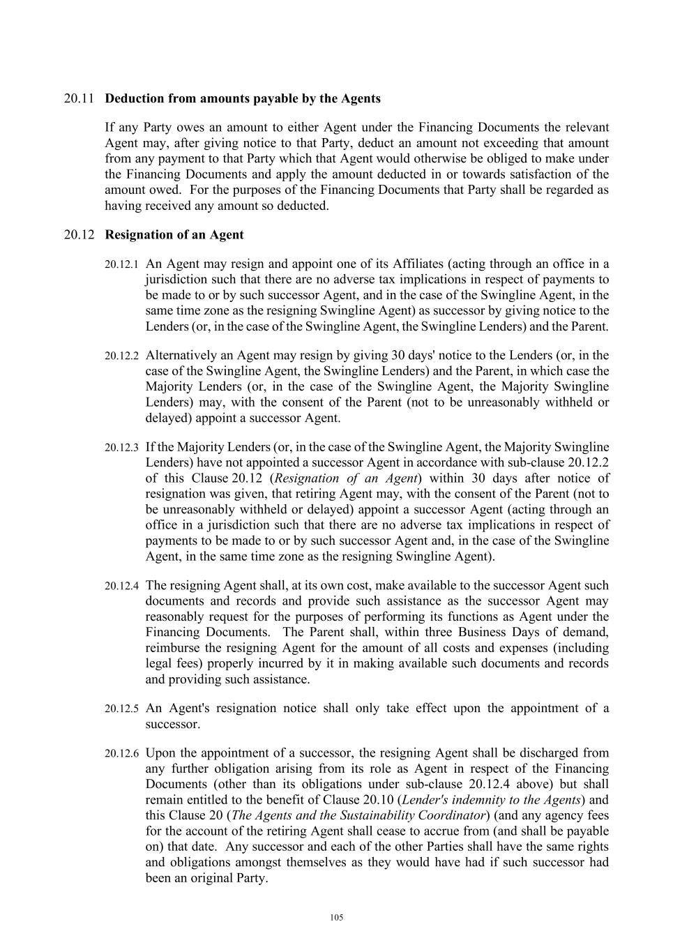 105 20.11 Deduction from amounts payable by the Agents If any Party owes an amount to either Agent under the Financing Documents the relevant Agent may, after giving notice to that Party, deduct an amount not exceeding that amount from any payment to that Party which that Agent would otherwise be obliged to make under the Financing Documents and apply the amount deducted in or towards satisfaction of the amount owed. For the purposes of the Financing Documents that Party shall be regarded as having received any amount so deducted. 20.12 Resignation of an Agent 20.12.1 An Agent may resign and appoint one of its Affiliates (acting through an office in a jurisdiction such that there are no adverse tax implications in respect of payments to be made to or by such successor Agent, and in the case of the Swingline Agent, in the same time zone as the resigning Swingline Agent) as successor by giving notice to the Lenders (or, in the case of the Swingline Agent, the Swingline Lenders) and the Parent. 20.12.2 Alternatively an Agent may resign by giving 30 days' notice to the Lenders (or, in the case of the Swingline Agent, the Swingline Lenders) and the Parent, in which case the Majority Lenders (or, in the case of the Swingline Agent, the Majority Swingline Lenders) may, with the consent of the Parent (not to be unreasonably withheld or delayed) appoint a successor Agent. 20.12.3 If the Majority Lenders (or, in the case of the Swingline Agent, the Majority Swingline Lenders) have not appointed a successor Agent in accordance with sub-clause 20.12.2 of this Clause 20.12 (Resignation of an Agent) within 30 days after notice of resignation was given, that retiring Agent may, with the consent of the Parent (not to be unreasonably withheld or delayed) appoint a successor Agent (acting through an office in a jurisdiction such that there are no adverse tax implications in respect of payments to be made to or by such successor Agent and, in the case of the Swingline Agent, in the same time zone as the resigning Swingline Agent). 20.12.4 The resigning Agent shall, at its own cost, make available to the successor Agent such documents and records and provide such assistance as the successor Agent may reasonably request for the purposes of performing its functions as Agent under the Financing Documents. The Parent shall, within three Business Days of demand, reimburse the resigning Agent for the amount of all costs and expenses (including legal fees) properly incurred by it in making available such documents and records and providing such assistance. 20.12.5 An Agent's resignation notice shall only take effect upon the appointment of a successor. 20.12.6 Upon the appointment of a successor, the resigning Agent shall be discharged from any further obligation arising from its role as Agent in respect of the Financing Documents (other than its obligations under sub-clause 20.12.4 above) but shall remain entitled to the benefit of Clause 20.10 (Lender's indemnity to the Agents) and this Clause 20 (The Agents and the Sustainability Coordinator) (and any agency fees for the account of the retiring Agent shall cease to accrue from (and shall be payable on) that date. Any successor and each of the other Parties shall have the same rights and obligations amongst themselves as they would have had if such successor had been an original Party.