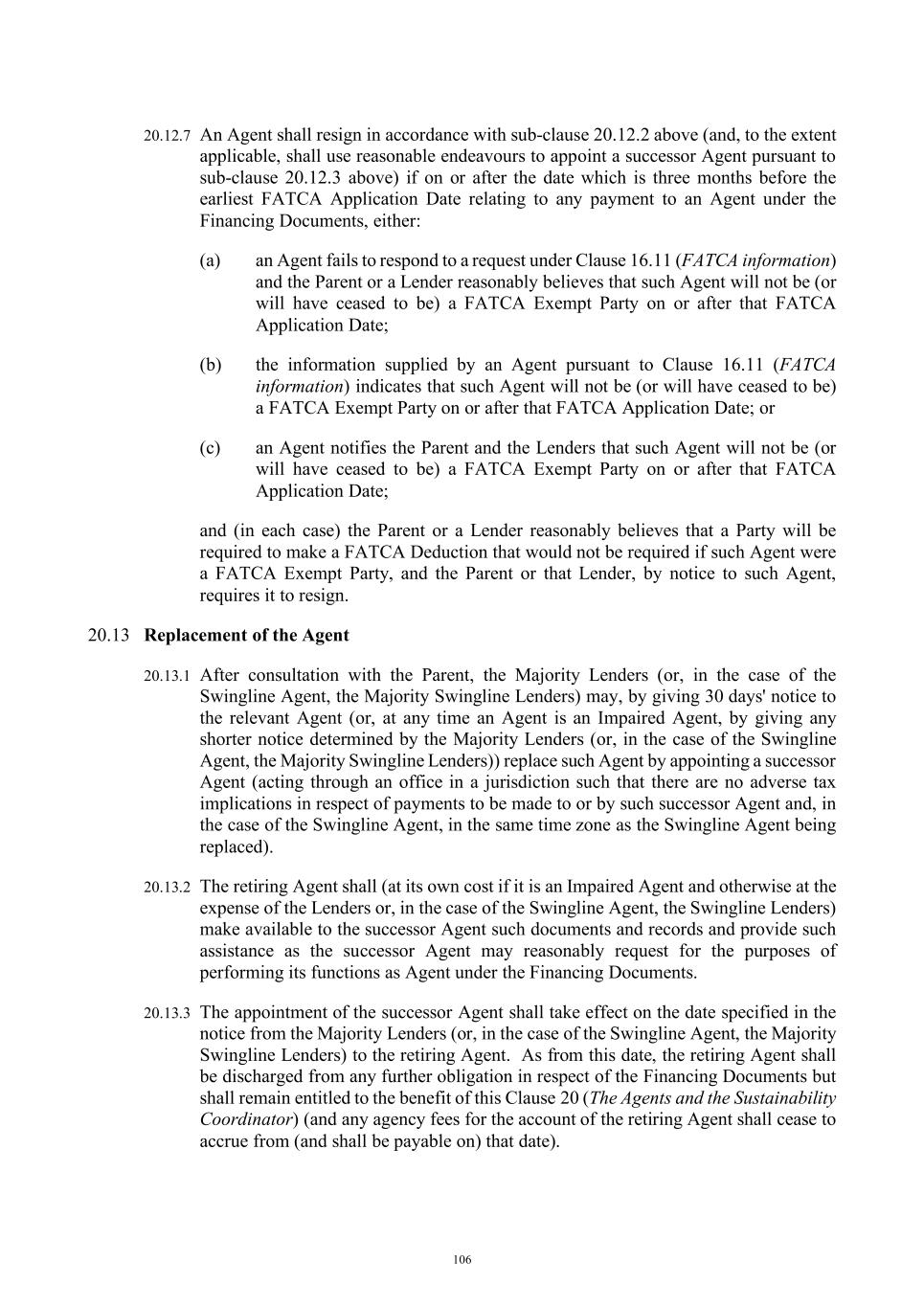 106 20.12.7 An Agent shall resign in accordance with sub-clause 20.12.2 above (and, to the extent applicable, shall use reasonable endeavours to appoint a successor Agent pursuant to sub-clause 20.12.3 above) if on or after the date which is three months before the earliest FATCA Application Date relating to any payment to an Agent under the Financing Documents, either: (a) an Agent fails to respond to a request under Clause 16.11 (FATCA information) and the Parent or a Lender reasonably believes that such Agent will not be (or will have ceased to be) a FATCA Exempt Party on or after that FATCA Application Date; (b) the information supplied by an Agent pursuant to Clause 16.11 (FATCA information) indicates that such Agent will not be (or will have ceased to be) a FATCA Exempt Party on or after that FATCA Application Date; or (c) an Agent notifies the Parent and the Lenders that such Agent will not be (or will have ceased to be) a FATCA Exempt Party on or after that FATCA Application Date; and (in each case) the Parent or a Lender reasonably believes that a Party will be required to make a FATCA Deduction that would not be required if such Agent were a FATCA Exempt Party, and the Parent or that Lender, by notice to such Agent, requires it to resign. 20.13 Replacement of the Agent 20.13.1 After consultation with the Parent, the Majority Lenders (or, in the case of the Swingline Agent, the Majority Swingline Lenders) may, by giving 30 days' notice to the relevant Agent (or, at any time an Agent is an Impaired Agent, by giving any shorter notice determined by the Majority Lenders (or, in the case of the Swingline Agent, the Majority Swingline Lenders)) replace such Agent by appointing a successor Agent (acting through an office in a jurisdiction such that there are no adverse tax implications in respect of payments to be made to or by such successor Agent and, in the case of the Swingline Agent, in the same time zone as the Swingline Agent being replaced). 20.13.2 The retiring Agent shall (at its own cost if it is an Impaired Agent and otherwise at the expense of the Lenders or, in the case of the Swingline Agent, the Swingline Lenders) make available to the successor Agent such documents and records and provide such assistance as the successor Agent may reasonably request for the purposes of performing its functions as Agent under the Financing Documents. 20.13.3 The appointment of the successor Agent shall take effect on the date specified in the notice from the Majority Lenders (or, in the case of the Swingline Agent, the Majority Swingline Lenders) to the retiring Agent. As from this date, the retiring Agent shall be discharged from any further obligation in respect of the Financing Documents but shall remain entitled to the benefit of this Clause 20 (The Agents and the Sustainability Coordinator) (and any agency fees for the account of the retiring Agent shall cease to accrue from (and shall be payable on) that date).