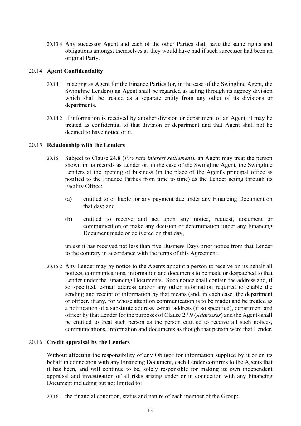 107 20.13.4 Any successor Agent and each of the other Parties shall have the same rights and obligations amongst themselves as they would have had if such successor had been an original Party. 20.14 Agent Confidentiality 20.14.1 In acting as Agent for the Finance Parties (or, in the case of the Swingline Agent, the Swingline Lenders) an Agent shall be regarded as acting through its agency division which shall be treated as a separate entity from any other of its divisions or departments. 20.14.2 If information is received by another division or department of an Agent, it may be treated as confidential to that division or department and that Agent shall not be deemed to have notice of it. 20.15 Relationship with the Lenders 20.15.1 Subject to Clause 24.8 (Pro rata interest settlement), an Agent may treat the person shown in its records as Lender or, in the case of the Swingline Agent, the Swingline Lenders at the opening of business (in the place of the Agent's principal office as notified to the Finance Parties from time to time) as the Lender acting through its Facility Office: (a) entitled to or liable for any payment due under any Financing Document on that day; and (b) entitled to receive and act upon any notice, request, document or communication or make any decision or determination under any Financing Document made or delivered on that day, unless it has received not less than five Business Days prior notice from that Lender to the contrary in accordance with the terms of this Agreement. 20.15.2 Any Lender may by notice to the Agents appoint a person to receive on its behalf all notices, communications, information and documents to be made or despatched to that Lender under the Financing Documents. Such notice shall contain the address and, if so specified, e-mail address and/or any other information required to enable the sending and receipt of information by that means (and, in each case, the department or officer, if any, for whose attention communication is to be made) and be treated as a notification of a substitute address, e-mail address (if so specified), department and officer by that Lender for the purposes of Clause 27.9 (Addresses) and the Agents shall be entitled to treat such person as the person entitled to receive all such notices, communications, information and documents as though that person were that Lender. 20.16 Credit appraisal by the Lenders Without affecting the responsibility of any Obligor for information supplied by it or on its behalf in connection with any Financing Document, each Lender confirms to the Agents that it has been, and will continue to be, solely responsible for making its own independent appraisal and investigation of all risks arising under or in connection with any Financing Document including but not limited to: 20.16.1 the financial condition, status and nature of each member of the Group;