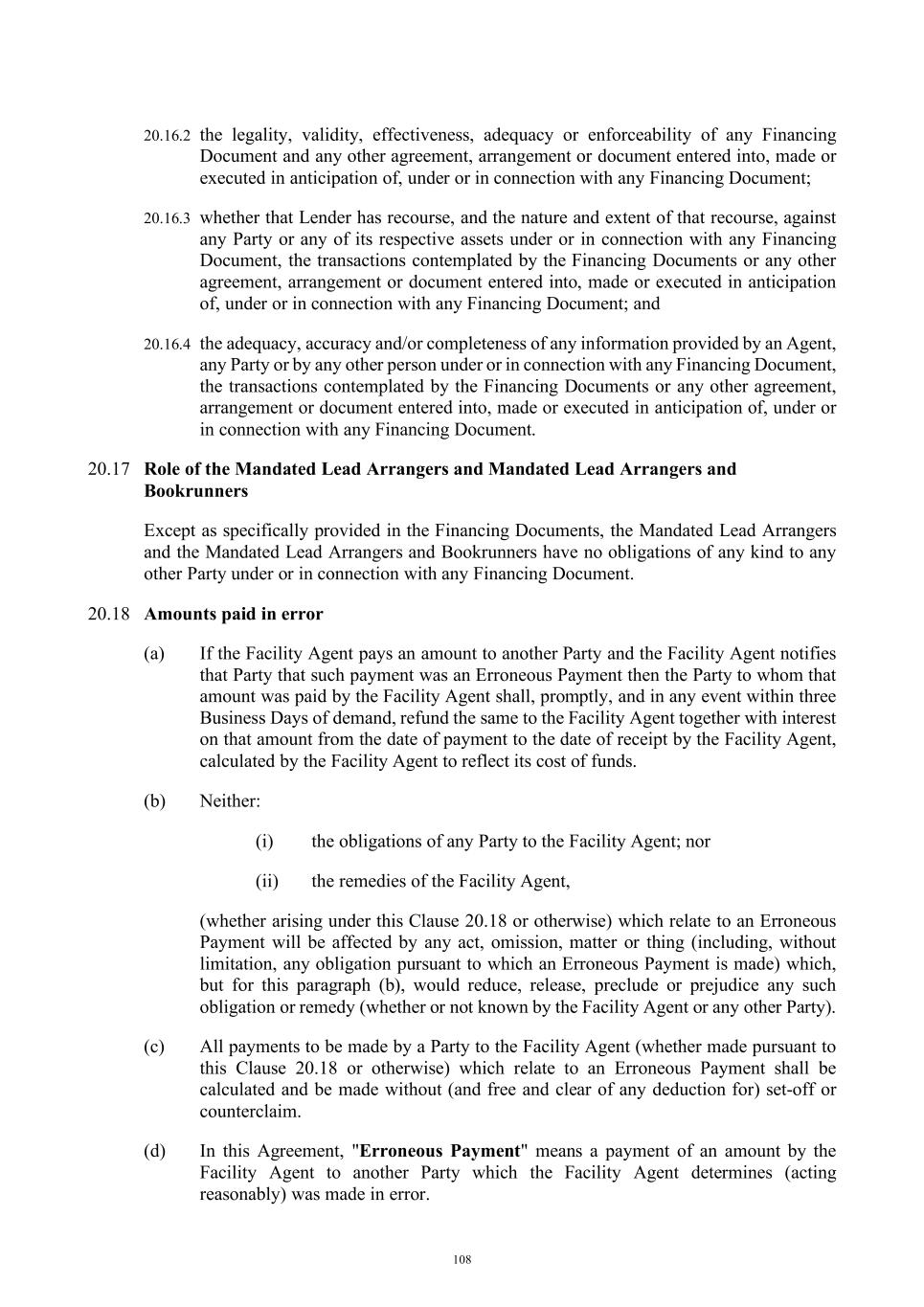 108 20.16.2 the legality, validity, effectiveness, adequacy or enforceability of any Financing Document and any other agreement, arrangement or document entered into, made or executed in anticipation of, under or in connection with any Financing Document; 20.16.3 whether that Lender has recourse, and the nature and extent of that recourse, against any Party or any of its respective assets under or in connection with any Financing Document, the transactions contemplated by the Financing Documents or any other agreement, arrangement or document entered into, made or executed in anticipation of, under or in connection with any Financing Document; and 20.16.4 the adequacy, accuracy and/or completeness of any information provided by an Agent, any Party or by any other person under or in connection with any Financing Document, the transactions contemplated by the Financing Documents or any other agreement, arrangement or document entered into, made or executed in anticipation of, under or in connection with any Financing Document. 20.17 Role of the Mandated Lead Arrangers and Mandated Lead Arrangers and Bookrunners Except as specifically provided in the Financing Documents, the Mandated Lead Arrangers and the Mandated Lead Arrangers and Bookrunners have no obligations of any kind to any other Party under or in connection with any Financing Document. 20.18 Amounts paid in error (a) If the Facility Agent pays an amount to another Party and the Facility Agent notifies that Party that such payment was an Erroneous Payment then the Party to whom that amount was paid by the Facility Agent shall, promptly, and in any event within three Business Days of demand, refund the same to the Facility Agent together with interest on that amount from the date of payment to the date of receipt by the Facility Agent, calculated by the Facility Agent to reflect its cost of funds. (b) Neither: (i) the obligations of any Party to the Facility Agent; nor (ii) the remedies of the Facility Agent, (whether arising under this Clause 20.18 or otherwise) which relate to an Erroneous Payment will be affected by any act, omission, matter or thing (including, without limitation, any obligation pursuant to which an Erroneous Payment is made) which, but for this paragraph (b), would reduce, release, preclude or prejudice any such obligation or remedy (whether or not known by the Facility Agent or any other Party). (c) All payments to be made by a Party to the Facility Agent (whether made pursuant to this Clause 20.18 or otherwise) which relate to an Erroneous Payment shall be calculated and be made without (and free and clear of any deduction for) set-off or counterclaim. (d) In this Agreement, "Erroneous Payment" means a payment of an amount by the Facility Agent to another Party which the Facility Agent determines (acting reasonably) was made in error.