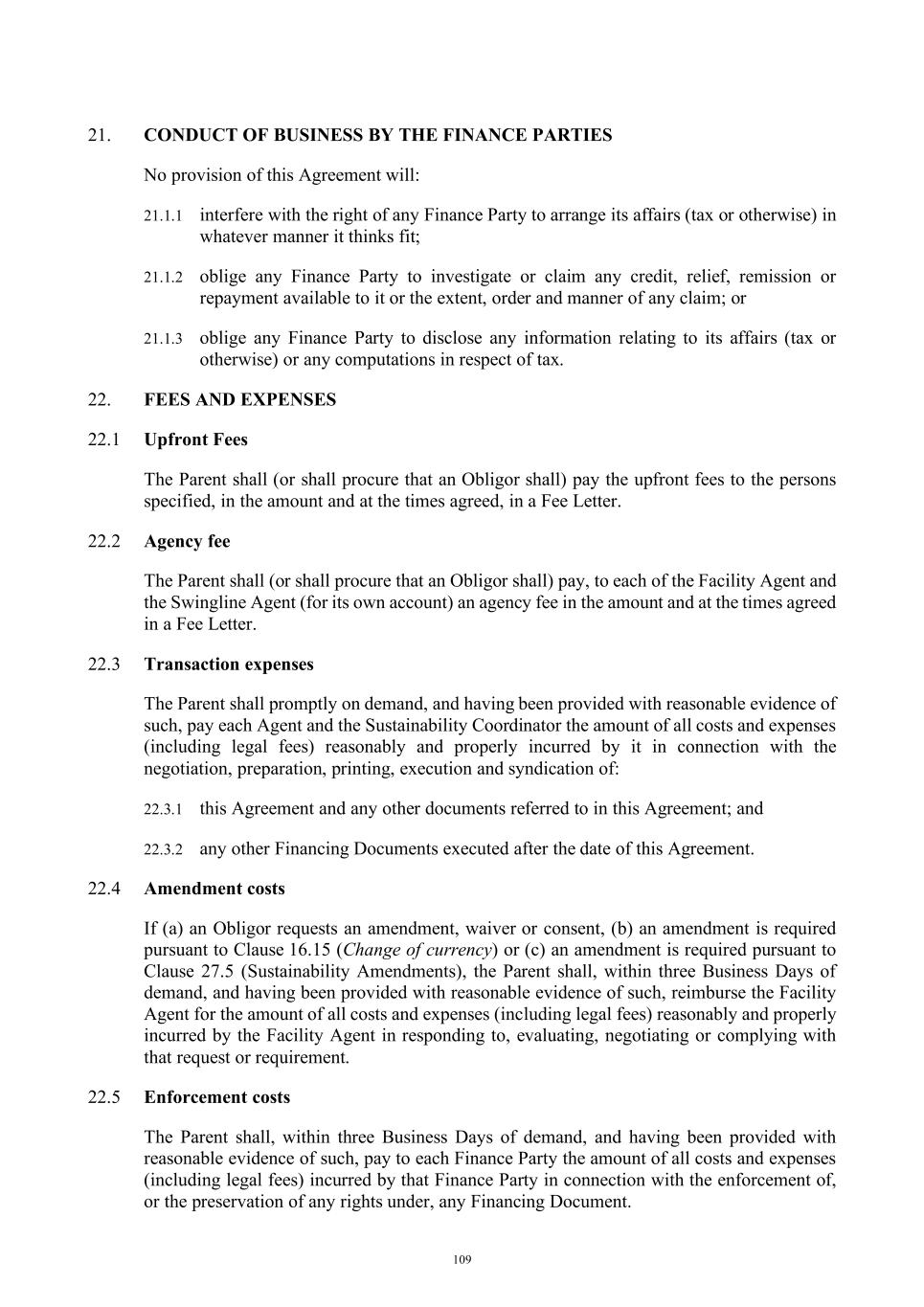 109 21. CONDUCT OF BUSINESS BY THE FINANCE PARTIES No provision of this Agreement will: 21.1.1 interfere with the right of any Finance Party to arrange its affairs (tax or otherwise) in whatever manner it thinks fit; 21.1.2 oblige any Finance Party to investigate or claim any credit, relief, remission or repayment available to it or the extent, order and manner of any claim; or 21.1.3 oblige any Finance Party to disclose any information relating to its affairs (tax or otherwise) or any computations in respect of tax. 22. FEES AND EXPENSES 22.1 Upfront Fees The Parent shall (or shall procure that an Obligor shall) pay the upfront fees to the persons specified, in the amount and at the times agreed, in a Fee Letter. 22.2 Agency fee The Parent shall (or shall procure that an Obligor shall) pay, to each of the Facility Agent and the Swingline Agent (for its own account) an agency fee in the amount and at the times agreed in a Fee Letter. 22.3 Transaction expenses The Parent shall promptly on demand, and having been provided with reasonable evidence of such, pay each Agent and the Sustainability Coordinator the amount of all costs and expenses (including legal fees) reasonably and properly incurred by it in connection with the negotiation, preparation, printing, execution and syndication of: 22.3.1 this Agreement and any other documents referred to in this Agreement; and 22.3.2 any other Financing Documents executed after the date of this Agreement. 22.4 Amendment costs If (a) an Obligor requests an amendment, waiver or consent, (b) an amendment is required pursuant to Clause 16.15 (Change of currency) or (c) an amendment is required pursuant to Clause 27.5 (Sustainability Amendments), the Parent shall, within three Business Days of demand, and having been provided with reasonable evidence of such, reimburse the Facility Agent for the amount of all costs and expenses (including legal fees) reasonably and properly incurred by the Facility Agent in responding to, evaluating, negotiating or complying with that request or requirement. 22.5 Enforcement costs The Parent shall, within three Business Days of demand, and having been provided with reasonable evidence of such, pay to each Finance Party the amount of all costs and expenses (including legal fees) incurred by that Finance Party in connection with the enforcement of, or the preservation of any rights under, any Financing Document.