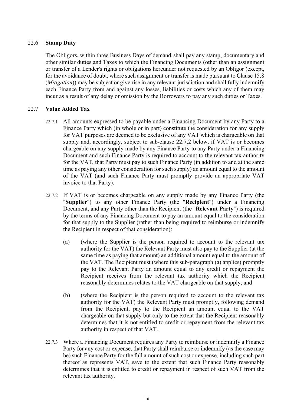 110 22.6 Stamp Duty The Obligors, within three Business Days of demand, shall pay any stamp, documentary and other similar duties and Taxes to which the Financing Documents (other than an assignment or transfer of a Lender's rights or obligations hereunder not requested by an Obligor (except, for the avoidance of doubt, where such assignment or transfer is made pursuant to Clause 15.8 (Mitigation)) may be subject or give rise in any relevant jurisdiction and shall fully indemnify each Finance Party from and against any losses, liabilities or costs which any of them may incur as a result of any delay or omission by the Borrowers to pay any such duties or Taxes. 22.7 Value Added Tax 22.7.1 All amounts expressed to be payable under a Financing Document by any Party to a Finance Party which (in whole or in part) constitute the consideration for any supply for VAT purposes are deemed to be exclusive of any VAT which is chargeable on that supply and, accordingly, subject to sub-clause 22.7.2 below, if VAT is or becomes chargeable on any supply made by any Finance Party to any Party under a Financing Document and such Finance Party is required to account to the relevant tax authority for the VAT, that Party must pay to such Finance Party (in addition to and at the same time as paying any other consideration for such supply) an amount equal to the amount of the VAT (and such Finance Party must promptly provide an appropriate VAT invoice to that Party). 22.7.2 If VAT is or becomes chargeable on any supply made by any Finance Party (the "Supplier") to any other Finance Party (the "Recipient") under a Financing Document, and any Party other than the Recipient (the "Relevant Party") is required by the terms of any Financing Document to pay an amount equal to the consideration for that supply to the Supplier (rather than being required to reimburse or indemnify the Recipient in respect of that consideration): (a) (where the Supplier is the person required to account to the relevant tax authority for the VAT) the Relevant Party must also pay to the Supplier (at the same time as paying that amount) an additional amount equal to the amount of the VAT. The Recipient must (where this sub-paragraph (a) applies) promptly pay to the Relevant Party an amount equal to any credit or repayment the Recipient receives from the relevant tax authority which the Recipient reasonably determines relates to the VAT chargeable on that supply; and (b) (where the Recipient is the person required to account to the relevant tax authority for the VAT) the Relevant Party must promptly, following demand from the Recipient, pay to the Recipient an amount equal to the VAT chargeable on that supply but only to the extent that the Recipient reasonably determines that it is not entitled to credit or repayment from the relevant tax authority in respect of that VAT. 22.7.3 Where a Financing Document requires any Party to reimburse or indemnify a Finance Party for any cost or expense, that Party shall reimburse or indemnify (as the case may be) such Finance Party for the full amount of such cost or expense, including such part thereof as represents VAT, save to the extent that such Finance Party reasonably determines that it is entitled to credit or repayment in respect of such VAT from the relevant tax authority.
