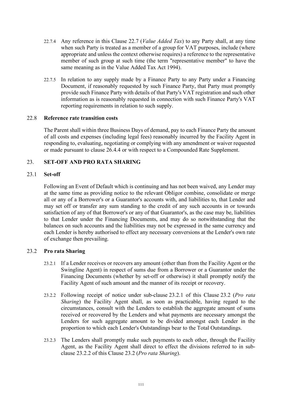 111 22.7.4 Any reference in this Clause 22.7 (Value Added Tax) to any Party shall, at any time when such Party is treated as a member of a group for VAT purposes, include (where appropriate and unless the context otherwise requires) a reference to the representative member of such group at such time (the term "representative member" to have the same meaning as in the Value Added Tax Act 1994). 22.7.5 In relation to any supply made by a Finance Party to any Party under a Financing Document, if reasonably requested by such Finance Party, that Party must promptly provide such Finance Party with details of that Party's VAT registration and such other information as is reasonably requested in connection with such Finance Party's VAT reporting requirements in relation to such supply. 22.8 Reference rate transition costs The Parent shall within three Business Days of demand, pay to each Finance Party the amount of all costs and expenses (including legal fees) reasonably incurred by the Facility Agent in responding to, evaluating, negotiating or complying with any amendment or waiver requested or made pursuant to clause 26.4.4 or with respect to a Compounded Rate Supplement. 23. SET-OFF AND PRO RATA SHARING 23.1 Set-off Following an Event of Default which is continuing and has not been waived, any Lender may at the same time as providing notice to the relevant Obligor combine, consolidate or merge all or any of a Borrower's or a Guarantor's accounts with, and liabilities to, that Lender and may set off or transfer any sum standing to the credit of any such accounts in or towards satisfaction of any of that Borrower's or any of that Guarantor's, as the case may be, liabilities to that Lender under the Financing Documents, and may do so notwithstanding that the balances on such accounts and the liabilities may not be expressed in the same currency and each Lender is hereby authorised to effect any necessary conversions at the Lender's own rate of exchange then prevailing. 23.2 Pro rata Sharing 23.2.1 If a Lender receives or recovers any amount (other than from the Facility Agent or the Swingline Agent) in respect of sums due from a Borrower or a Guarantor under the Financing Documents (whether by set-off or otherwise) it shall promptly notify the Facility Agent of such amount and the manner of its receipt or recovery. 23.2.2 Following receipt of notice under sub-clause 23.2.1 of this Clause 23.2 (Pro rata Sharing) the Facility Agent shall, as soon as practicable, having regard to the circumstances, consult with the Lenders to establish the aggregate amount of sums received or recovered by the Lenders and what payments are necessary amongst the Lenders for such aggregate amount to be divided amongst each Lender in the proportion to which each Lender's Outstandings bear to the Total Outstandings. 23.2.3 The Lenders shall promptly make such payments to each other, through the Facility Agent, as the Facility Agent shall direct to effect the divisions referred to in sub- clause 23.2.2 of this Clause 23.2 (Pro rata Sharing).