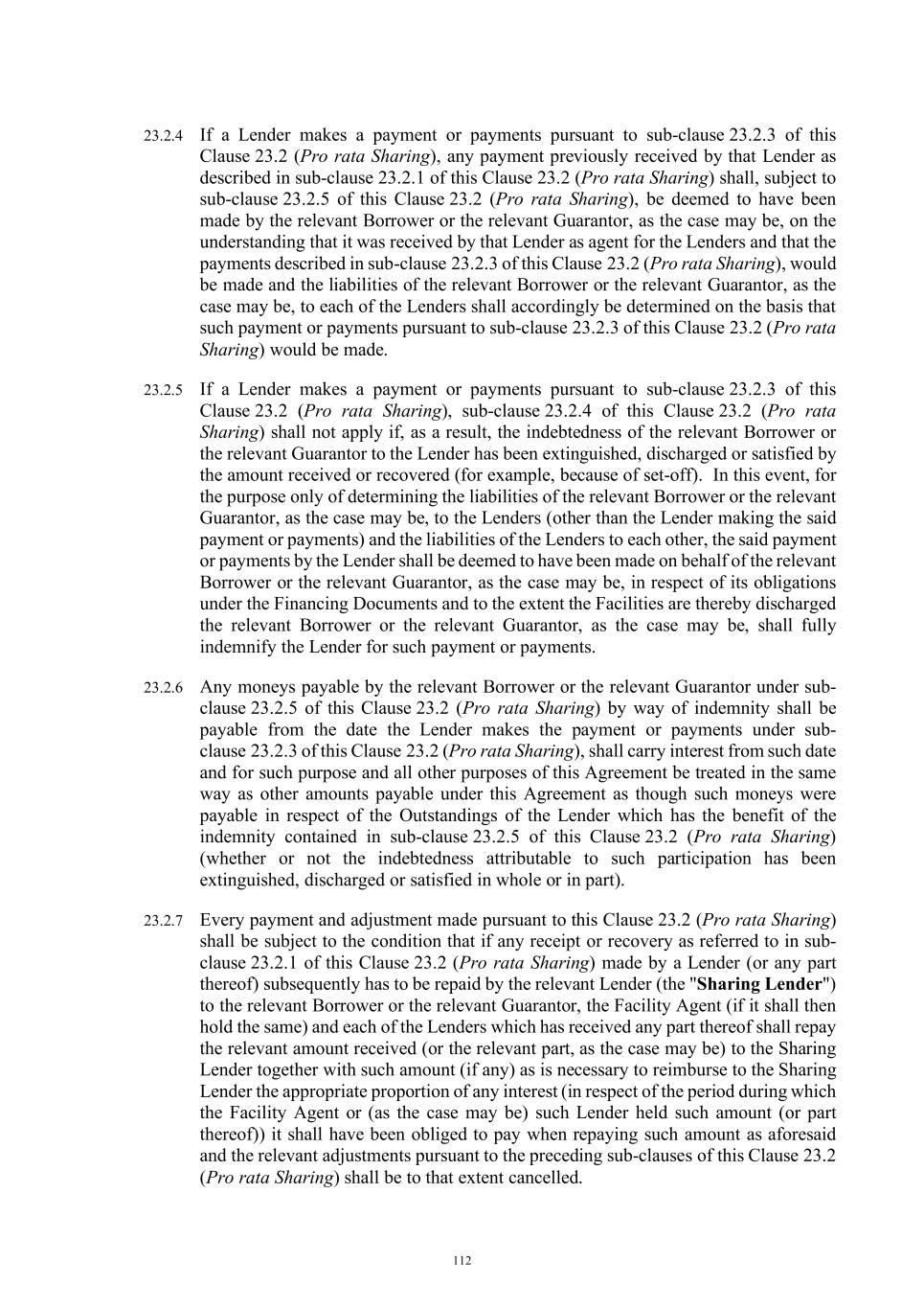 112 23.2.4 If a Lender makes a payment or payments pursuant to sub-clause 23.2.3 of this Clause 23.2 (Pro rata Sharing), any payment previously received by that Lender as described in sub-clause 23.2.1 of this Clause 23.2 (Pro rata Sharing) shall, subject to sub-clause 23.2.5 of this Clause 23.2 (Pro rata Sharing), be deemed to have been made by the relevant Borrower or the relevant Guarantor, as the case may be, on the understanding that it was received by that Lender as agent for the Lenders and that the payments described in sub-clause 23.2.3 of this Clause 23.2 (Pro rata Sharing), would be made and the liabilities of the relevant Borrower or the relevant Guarantor, as the case may be, to each of the Lenders shall accordingly be determined on the basis that such payment or payments pursuant to sub-clause 23.2.3 of this Clause 23.2 (Pro rata Sharing) would be made. 23.2.5 If a Lender makes a payment or payments pursuant to sub-clause 23.2.3 of this Clause 23.2 (Pro rata Sharing), sub-clause 23.2.4 of this Clause 23.2 (Pro rata Sharing) shall not apply if, as a result, the indebtedness of the relevant Borrower or the relevant Guarantor to the Lender has been extinguished, discharged or satisfied by the amount received or recovered (for example, because of set-off). In this event, for the purpose only of determining the liabilities of the relevant Borrower or the relevant Guarantor, as the case may be, to the Lenders (other than the Lender making the said payment or payments) and the liabilities of the Lenders to each other, the said payment or payments by the Lender shall be deemed to have been made on behalf of the relevant Borrower or the relevant Guarantor, as the case may be, in respect of its obligations under the Financing Documents and to the extent the Facilities are thereby discharged the relevant Borrower or the relevant Guarantor, as the case may be, shall fully indemnify the Lender for such payment or payments. 23.2.6 Any moneys payable by the relevant Borrower or the relevant Guarantor under sub- clause 23.2.5 of this Clause 23.2 (Pro rata Sharing) by way of indemnity shall be payable from the date the Lender makes the payment or payments under sub- clause 23.2.3 of this Clause 23.2 (Pro rata Sharing), shall carry interest from such date and for such purpose and all other purposes of this Agreement be treated in the same way as other amounts payable under this Agreement as though such moneys were payable in respect of the Outstandings of the Lender which has the benefit of the indemnity contained in sub-clause 23.2.5 of this Clause 23.2 (Pro rata Sharing) (whether or not the indebtedness attributable to such participation has been extinguished, discharged or satisfied in whole or in part). 23.2.7 Every payment and adjustment made pursuant to this Clause 23.2 (Pro rata Sharing) shall be subject to the condition that if any receipt or recovery as referred to in sub- clause 23.2.1 of this Clause 23.2 (Pro rata Sharing) made by a Lender (or any part thereof) subsequently has to be repaid by the relevant Lender (the "Sharing Lender") to the relevant Borrower or the relevant Guarantor, the Facility Agent (if it shall then hold the same) and each of the Lenders which has received any part thereof shall repay the relevant amount received (or the relevant part, as the case may be) to the Sharing Lender together with such amount (if any) as is necessary to reimburse to the Sharing Lender the appropriate proportion of any interest (in respect of the period during which the Facility Agent or (as the case may be) such Lender held such amount (or part thereof)) it shall have been obliged to pay when repaying such amount as aforesaid and the relevant adjustments pursuant to the preceding sub-clauses of this Clause 23.2 (Pro rata Sharing) shall be to that extent cancelled.
