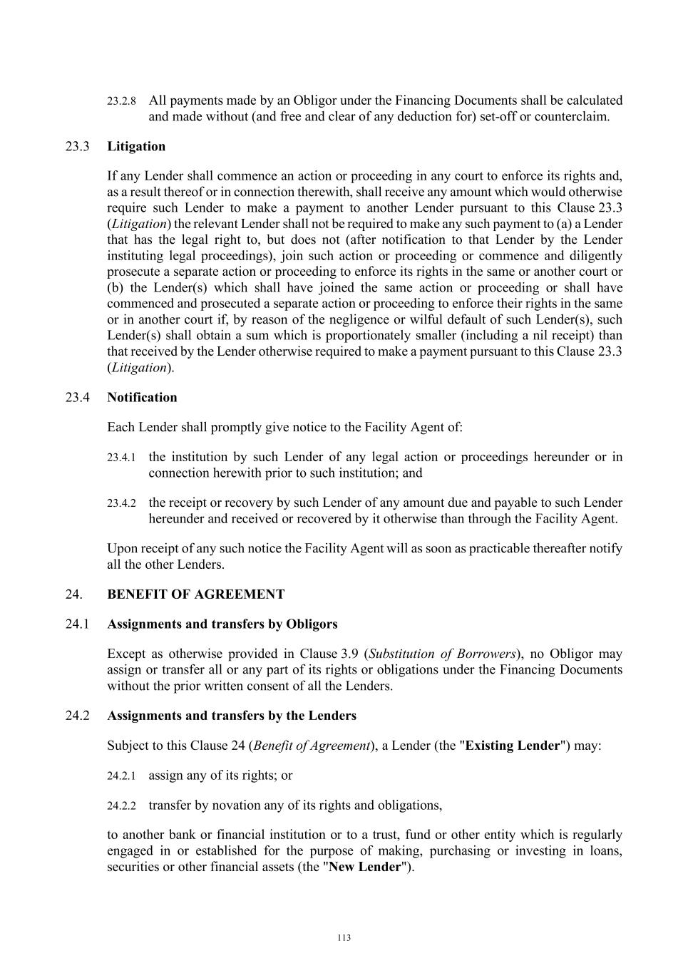 113 23.2.8 All payments made by an Obligor under the Financing Documents shall be calculated and made without (and free and clear of any deduction for) set-off or counterclaim. 23.3 Litigation If any Lender shall commence an action or proceeding in any court to enforce its rights and, as a result thereof or in connection therewith, shall receive any amount which would otherwise require such Lender to make a payment to another Lender pursuant to this Clause 23.3 (Litigation) the relevant Lender shall not be required to make any such payment to (a) a Lender that has the legal right to, but does not (after notification to that Lender by the Lender instituting legal proceedings), join such action or proceeding or commence and diligently prosecute a separate action or proceeding to enforce its rights in the same or another court or (b) the Lender(s) which shall have joined the same action or proceeding or shall have commenced and prosecuted a separate action or proceeding to enforce their rights in the same or in another court if, by reason of the negligence or wilful default of such Lender(s), such Lender(s) shall obtain a sum which is proportionately smaller (including a nil receipt) than that received by the Lender otherwise required to make a payment pursuant to this Clause 23.3 (Litigation). 23.4 Notification Each Lender shall promptly give notice to the Facility Agent of: 23.4.1 the institution by such Lender of any legal action or proceedings hereunder or in connection herewith prior to such institution; and 23.4.2 the receipt or recovery by such Lender of any amount due and payable to such Lender hereunder and received or recovered by it otherwise than through the Facility Agent. Upon receipt of any such notice the Facility Agent will as soon as practicable thereafter notify all the other Lenders. 24. BENEFIT OF AGREEMENT 24.1 Assignments and transfers by Obligors Except as otherwise provided in Clause 3.9 (Substitution of Borrowers), no Obligor may assign or transfer all or any part of its rights or obligations under the Financing Documents without the prior written consent of all the Lenders. 24.2 Assignments and transfers by the Lenders Subject to this Clause 24 (Benefit of Agreement), a Lender (the "Existing Lender") may: 24.2.1 assign any of its rights; or 24.2.2 transfer by novation any of its rights and obligations, to another bank or financial institution or to a trust, fund or other entity which is regularly engaged in or established for the purpose of making, purchasing or investing in loans, securities or other financial assets (the "New Lender").