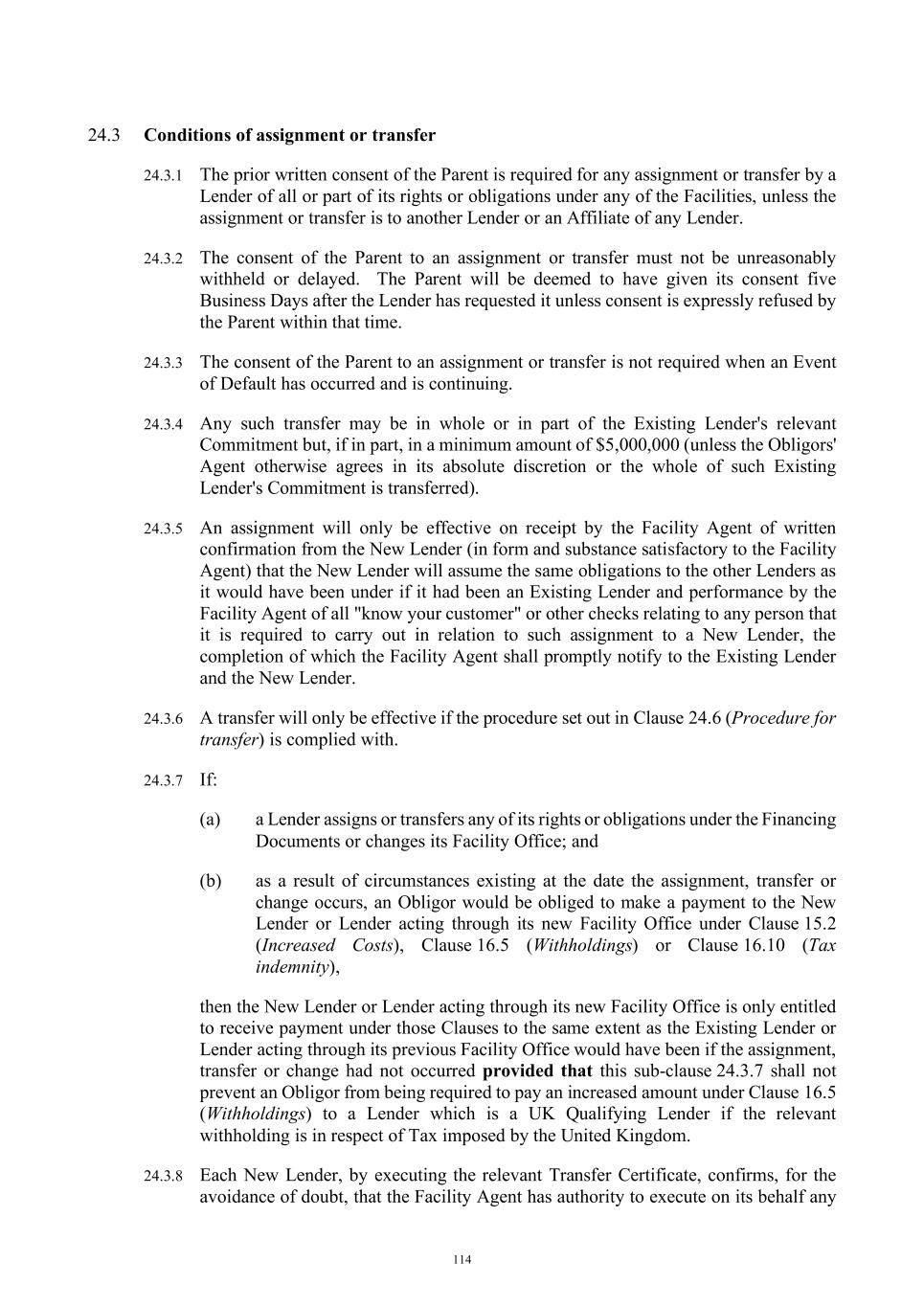 114 24.3 Conditions of assignment or transfer 24.3.1 The prior written consent of the Parent is required for any assignment or transfer by a Lender of all or part of its rights or obligations under any of the Facilities, unless the assignment or transfer is to another Lender or an Affiliate of any Lender. 24.3.2 The consent of the Parent to an assignment or transfer must not be unreasonably withheld or delayed. The Parent will be deemed to have given its consent five Business Days after the Lender has requested it unless consent is expressly refused by the Parent within that time. 24.3.3 The consent of the Parent to an assignment or transfer is not required when an Event of Default has occurred and is continuing. 24.3.4 Any such transfer may be in whole or in part of the Existing Lender's relevant Commitment but, if in part, in a minimum amount of $5,000,000 (unless the Obligors' Agent otherwise agrees in its absolute discretion or the whole of such Existing Lender's Commitment is transferred). 24.3.5 An assignment will only be effective on receipt by the Facility Agent of written confirmation from the New Lender (in form and substance satisfactory to the Facility Agent) that the New Lender will assume the same obligations to the other Lenders as it would have been under if it had been an Existing Lender and performance by the Facility Agent of all "know your customer" or other checks relating to any person that it is required to carry out in relation to such assignment to a New Lender, the completion of which the Facility Agent shall promptly notify to the Existing Lender and the New Lender. 24.3.6 A transfer will only be effective if the procedure set out in Clause 24.6 (Procedure for transfer) is complied with. 24.3.7 If: (a) a Lender assigns or transfers any of its rights or obligations under the Financing Documents or changes its Facility Office; and (b) as a result of circumstances existing at the date the assignment, transfer or change occurs, an Obligor would be obliged to make a payment to the New Lender or Lender acting through its new Facility Office under Clause 15.2 (Increased Costs), Clause 16.5 (Withholdings) or Clause 16.10 (Tax indemnity), then the New Lender or Lender acting through its new Facility Office is only entitled to receive payment under those Clauses to the same extent as the Existing Lender or Lender acting through its previous Facility Office would have been if the assignment, transfer or change had not occurred provided that this sub-clause 24.3.7 shall not prevent an Obligor from being required to pay an increased amount under Clause 16.5 (Withholdings) to a Lender which is a UK Qualifying Lender if the relevant withholding is in respect of Tax imposed by the United Kingdom. 24.3.8 Each New Lender, by executing the relevant Transfer Certificate, confirms, for the avoidance of doubt, that the Facility Agent has authority to execute on its behalf any