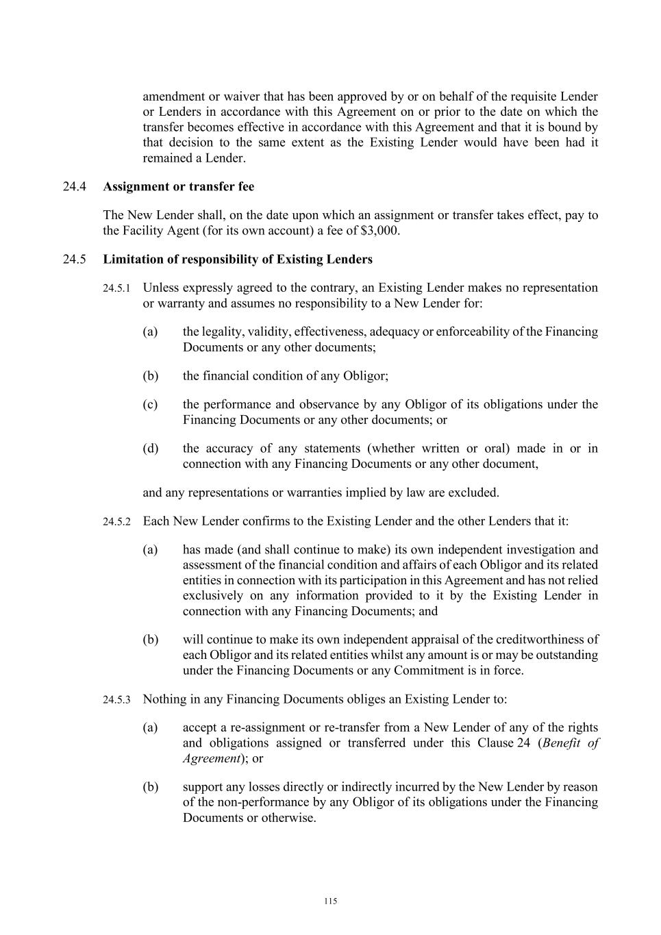 115 amendment or waiver that has been approved by or on behalf of the requisite Lender or Lenders in accordance with this Agreement on or prior to the date on which the transfer becomes effective in accordance with this Agreement and that it is bound by that decision to the same extent as the Existing Lender would have been had it remained a Lender. 24.4 Assignment or transfer fee The New Lender shall, on the date upon which an assignment or transfer takes effect, pay to the Facility Agent (for its own account) a fee of $3,000. 24.5 Limitation of responsibility of Existing Lenders 24.5.1 Unless expressly agreed to the contrary, an Existing Lender makes no representation or warranty and assumes no responsibility to a New Lender for: (a) the legality, validity, effectiveness, adequacy or enforceability of the Financing Documents or any other documents; (b) the financial condition of any Obligor; (c) the performance and observance by any Obligor of its obligations under the Financing Documents or any other documents; or (d) the accuracy of any statements (whether written or oral) made in or in connection with any Financing Documents or any other document, and any representations or warranties implied by law are excluded. 24.5.2 Each New Lender confirms to the Existing Lender and the other Lenders that it: (a) has made (and shall continue to make) its own independent investigation and assessment of the financial condition and affairs of each Obligor and its related entities in connection with its participation in this Agreement and has not relied exclusively on any information provided to it by the Existing Lender in connection with any Financing Documents; and (b) will continue to make its own independent appraisal of the creditworthiness of each Obligor and its related entities whilst any amount is or may be outstanding under the Financing Documents or any Commitment is in force. 24.5.3 Nothing in any Financing Documents obliges an Existing Lender to: (a) accept a re-assignment or re-transfer from a New Lender of any of the rights and obligations assigned or transferred under this Clause 24 (Benefit of Agreement); or (b) support any losses directly or indirectly incurred by the New Lender by reason of the non-performance by any Obligor of its obligations under the Financing Documents or otherwise.