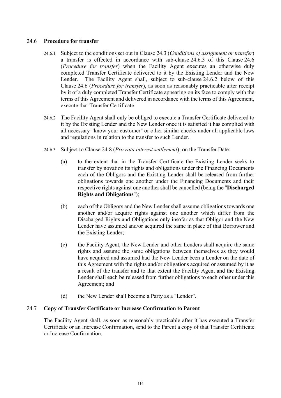116 24.6 Procedure for transfer 24.6.1 Subject to the conditions set out in Clause 24.3 (Conditions of assignment or transfer) a transfer is effected in accordance with sub-clause 24.6.3 of this Clause 24.6 (Procedure for transfer) when the Facility Agent executes an otherwise duly completed Transfer Certificate delivered to it by the Existing Lender and the New Lender. The Facility Agent shall, subject to sub-clause 24.6.2 below of this Clause 24.6 (Procedure for transfer), as soon as reasonably practicable after receipt by it of a duly completed Transfer Certificate appearing on its face to comply with the terms of this Agreement and delivered in accordance with the terms of this Agreement, execute that Transfer Certificate. 24.6.2 The Facility Agent shall only be obliged to execute a Transfer Certificate delivered to it by the Existing Lender and the New Lender once it is satisfied it has complied with all necessary "know your customer" or other similar checks under all applicable laws and regulations in relation to the transfer to such Lender. 24.6.3 Subject to Clause 24.8 (Pro rata interest settlement), on the Transfer Date: (a) to the extent that in the Transfer Certificate the Existing Lender seeks to transfer by novation its rights and obligations under the Financing Documents each of the Obligors and the Existing Lender shall be released from further obligations towards one another under the Financing Documents and their respective rights against one another shall be cancelled (being the "Discharged Rights and Obligations"); (b) each of the Obligors and the New Lender shall assume obligations towards one another and/or acquire rights against one another which differ from the Discharged Rights and Obligations only insofar as that Obligor and the New Lender have assumed and/or acquired the same in place of that Borrower and the Existing Lender; (c) the Facility Agent, the New Lender and other Lenders shall acquire the same rights and assume the same obligations between themselves as they would have acquired and assumed had the New Lender been a Lender on the date of this Agreement with the rights and/or obligations acquired or assumed by it as a result of the transfer and to that extent the Facility Agent and the Existing Lender shall each be released from further obligations to each other under this Agreement; and (d) the New Lender shall become a Party as a "Lender". 24.7 Copy of Transfer Certificate or Increase Confirmation to Parent The Facility Agent shall, as soon as reasonably practicable after it has executed a Transfer Certificate or an Increase Confirmation, send to the Parent a copy of that Transfer Certificate or Increase Confirmation.