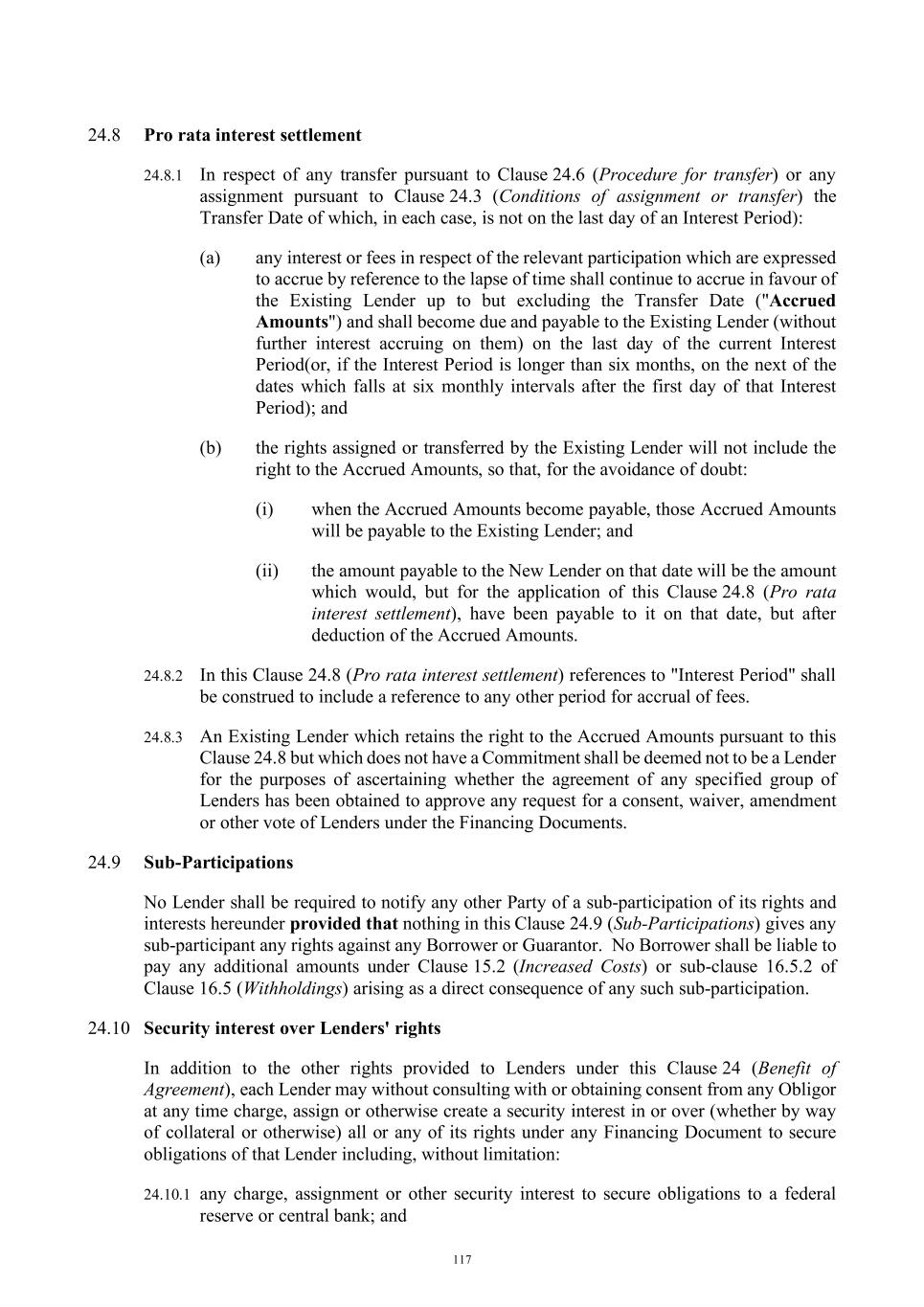 117 24.8 Pro rata interest settlement 24.8.1 In respect of any transfer pursuant to Clause 24.6 (Procedure for transfer) or any assignment pursuant to Clause 24.3 (Conditions of assignment or transfer) the Transfer Date of which, in each case, is not on the last day of an Interest Period): (a) any interest or fees in respect of the relevant participation which are expressed to accrue by reference to the lapse of time shall continue to accrue in favour of the Existing Lender up to but excluding the Transfer Date ("Accrued Amounts") and shall become due and payable to the Existing Lender (without further interest accruing on them) on the last day of the current Interest Period(or, if the Interest Period is longer than six months, on the next of the dates which falls at six monthly intervals after the first day of that Interest Period); and (b) the rights assigned or transferred by the Existing Lender will not include the right to the Accrued Amounts, so that, for the avoidance of doubt: (i) when the Accrued Amounts become payable, those Accrued Amounts will be payable to the Existing Lender; and (ii) the amount payable to the New Lender on that date will be the amount which would, but for the application of this Clause 24.8 (Pro rata interest settlement), have been payable to it on that date, but after deduction of the Accrued Amounts. 24.8.2 In this Clause 24.8 (Pro rata interest settlement) references to "Interest Period" shall be construed to include a reference to any other period for accrual of fees. 24.8.3 An Existing Lender which retains the right to the Accrued Amounts pursuant to this Clause 24.8 but which does not have a Commitment shall be deemed not to be a Lender for the purposes of ascertaining whether the agreement of any specified group of Lenders has been obtained to approve any request for a consent, waiver, amendment or other vote of Lenders under the Financing Documents. 24.9 Sub-Participations No Lender shall be required to notify any other Party of a sub-participation of its rights and interests hereunder provided that nothing in this Clause 24.9 (Sub-Participations) gives any sub-participant any rights against any Borrower or Guarantor. No Borrower shall be liable to pay any additional amounts under Clause 15.2 (Increased Costs) or sub-clause 16.5.2 of Clause 16.5 (Withholdings) arising as a direct consequence of any such sub-participation. 24.10 Security interest over Lenders' rights In addition to the other rights provided to Lenders under this Clause 24 (Benefit of Agreement), each Lender may without consulting with or obtaining consent from any Obligor at any time charge, assign or otherwise create a security interest in or over (whether by way of collateral or otherwise) all or any of its rights under any Financing Document to secure obligations of that Lender including, without limitation: 24.10.1 any charge, assignment or other security interest to secure obligations to a federal reserve or central bank; and