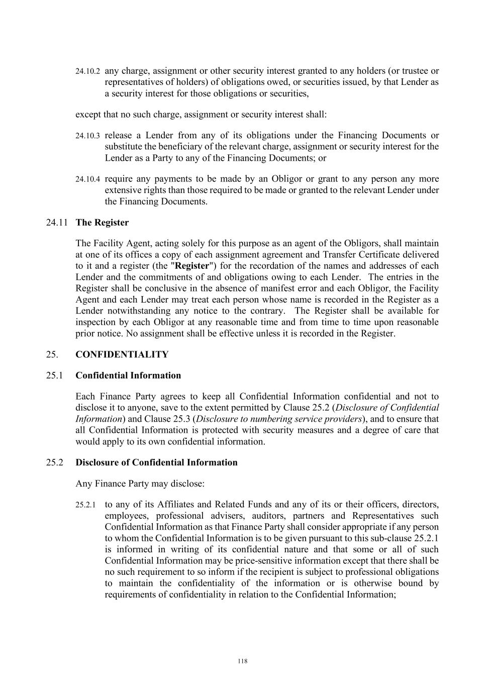 118 24.10.2 any charge, assignment or other security interest granted to any holders (or trustee or representatives of holders) of obligations owed, or securities issued, by that Lender as a security interest for those obligations or securities, except that no such charge, assignment or security interest shall: 24.10.3 release a Lender from any of its obligations under the Financing Documents or substitute the beneficiary of the relevant charge, assignment or security interest for the Lender as a Party to any of the Financing Documents; or 24.10.4 require any payments to be made by an Obligor or grant to any person any more extensive rights than those required to be made or granted to the relevant Lender under the Financing Documents. 24.11 The Register The Facility Agent, acting solely for this purpose as an agent of the Obligors, shall maintain at one of its offices a copy of each assignment agreement and Transfer Certificate delivered to it and a register (the "Register") for the recordation of the names and addresses of each Lender and the commitments of and obligations owing to each Lender. The entries in the Register shall be conclusive in the absence of manifest error and each Obligor, the Facility Agent and each Lender may treat each person whose name is recorded in the Register as a Lender notwithstanding any notice to the contrary. The Register shall be available for inspection by each Obligor at any reasonable time and from time to time upon reasonable prior notice. No assignment shall be effective unless it is recorded in the Register. 25. CONFIDENTIALITY 25.1 Confidential Information Each Finance Party agrees to keep all Confidential Information confidential and not to disclose it to anyone, save to the extent permitted by Clause 25.2 (Disclosure of Confidential Information) and Clause 25.3 (Disclosure to numbering service providers), and to ensure that all Confidential Information is protected with security measures and a degree of care that would apply to its own confidential information. 25.2 Disclosure of Confidential Information Any Finance Party may disclose: 25.2.1 to any of its Affiliates and Related Funds and any of its or their officers, directors, employees, professional advisers, auditors, partners and Representatives such Confidential Information as that Finance Party shall consider appropriate if any person to whom the Confidential Information is to be given pursuant to this sub-clause 25.2.1 is informed in writing of its confidential nature and that some or all of such Confidential Information may be price-sensitive information except that there shall be no such requirement to so inform if the recipient is subject to professional obligations to maintain the confidentiality of the information or is otherwise bound by requirements of confidentiality in relation to the Confidential Information;