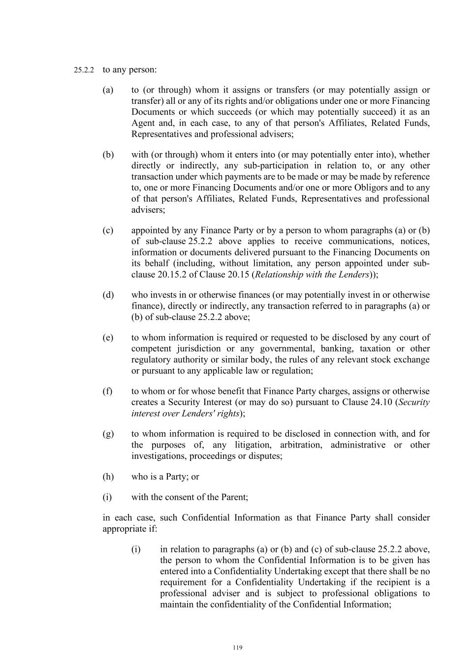 119 25.2.2 to any person: (a) to (or through) whom it assigns or transfers (or may potentially assign or transfer) all or any of its rights and/or obligations under one or more Financing Documents or which succeeds (or which may potentially succeed) it as an Agent and, in each case, to any of that person's Affiliates, Related Funds, Representatives and professional advisers; (b) with (or through) whom it enters into (or may potentially enter into), whether directly or indirectly, any sub-participation in relation to, or any other transaction under which payments are to be made or may be made by reference to, one or more Financing Documents and/or one or more Obligors and to any of that person's Affiliates, Related Funds, Representatives and professional advisers; (c) appointed by any Finance Party or by a person to whom paragraphs (a) or (b) of sub-clause 25.2.2 above applies to receive communications, notices, information or documents delivered pursuant to the Financing Documents on its behalf (including, without limitation, any person appointed under sub- clause 20.15.2 of Clause 20.15 (Relationship with the Lenders)); (d) who invests in or otherwise finances (or may potentially invest in or otherwise finance), directly or indirectly, any transaction referred to in paragraphs (a) or (b) of sub-clause 25.2.2 above; (e) to whom information is required or requested to be disclosed by any court of competent jurisdiction or any governmental, banking, taxation or other regulatory authority or similar body, the rules of any relevant stock exchange or pursuant to any applicable law or regulation; (f) to whom or for whose benefit that Finance Party charges, assigns or otherwise creates a Security Interest (or may do so) pursuant to Clause 24.10 (Security interest over Lenders' rights); (g) to whom information is required to be disclosed in connection with, and for the purposes of, any litigation, arbitration, administrative or other investigations, proceedings or disputes; (h) who is a Party; or (i) with the consent of the Parent; in each case, such Confidential Information as that Finance Party shall consider appropriate if: (i) in relation to paragraphs (a) or (b) and (c) of sub-clause 25.2.2 above, the person to whom the Confidential Information is to be given has entered into a Confidentiality Undertaking except that there shall be no requirement for a Confidentiality Undertaking if the recipient is a professional adviser and is subject to professional obligations to maintain the confidentiality of the Confidential Information;