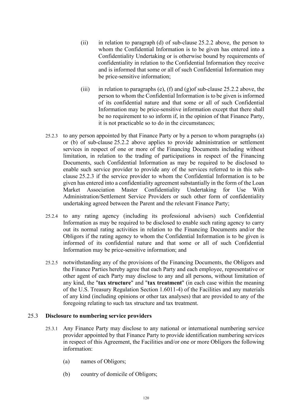 120 (ii) in relation to paragraph (d) of sub-clause 25.2.2 above, the person to whom the Confidential Information is to be given has entered into a Confidentiality Undertaking or is otherwise bound by requirements of confidentiality in relation to the Confidential Information they receive and is informed that some or all of such Confidential Information may be price-sensitive information; (iii) in relation to paragraphs (e), (f) and (g)of sub-clause 25.2.2 above, the person to whom the Confidential Information is to be given is informed of its confidential nature and that some or all of such Confidential Information may be price-sensitive information except that there shall be no requirement to so inform if, in the opinion of that Finance Party, it is not practicable so to do in the circumstances; 25.2.3 to any person appointed by that Finance Party or by a person to whom paragraphs (a) or (b) of sub-clause 25.2.2 above applies to provide administration or settlement services in respect of one or more of the Financing Documents including without limitation, in relation to the trading of participations in respect of the Financing Documents, such Confidential Information as may be required to be disclosed to enable such service provider to provide any of the services referred to in this sub- clause 25.2.3 if the service provider to whom the Confidential Information is to be given has entered into a confidentiality agreement substantially in the form of the Loan Market Association Master Confidentiality Undertaking for Use With Administration/Settlement Service Providers or such other form of confidentiality undertaking agreed between the Parent and the relevant Finance Party; 25.2.4 to any rating agency (including its professional advisers) such Confidential Information as may be required to be disclosed to enable such rating agency to carry out its normal rating activities in relation to the Financing Documents and/or the Obligors if the rating agency to whom the Confidential Information is to be given is informed of its confidential nature and that some or all of such Confidential Information may be price-sensitive information; and 25.2.5 notwithstanding any of the provisions of the Financing Documents, the Obligors and the Finance Parties hereby agree that each Party and each employee, representative or other agent of each Party may disclose to any and all persons, without limitation of any kind, the "tax structure" and "tax treatment" (in each case within the meaning of the U.S. Treasury Regulation Section 1.6011-4) of the Facilities and any materials of any kind (including opinions or other tax analyses) that are provided to any of the foregoing relating to such tax structure and tax treatment. 25.3 Disclosure to numbering service providers 25.3.1 Any Finance Party may disclose to any national or international numbering service provider appointed by that Finance Party to provide identification numbering services in respect of this Agreement, the Facilities and/or one or more Obligors the following information: (a) names of Obligors; (b) country of domicile of Obligors;
