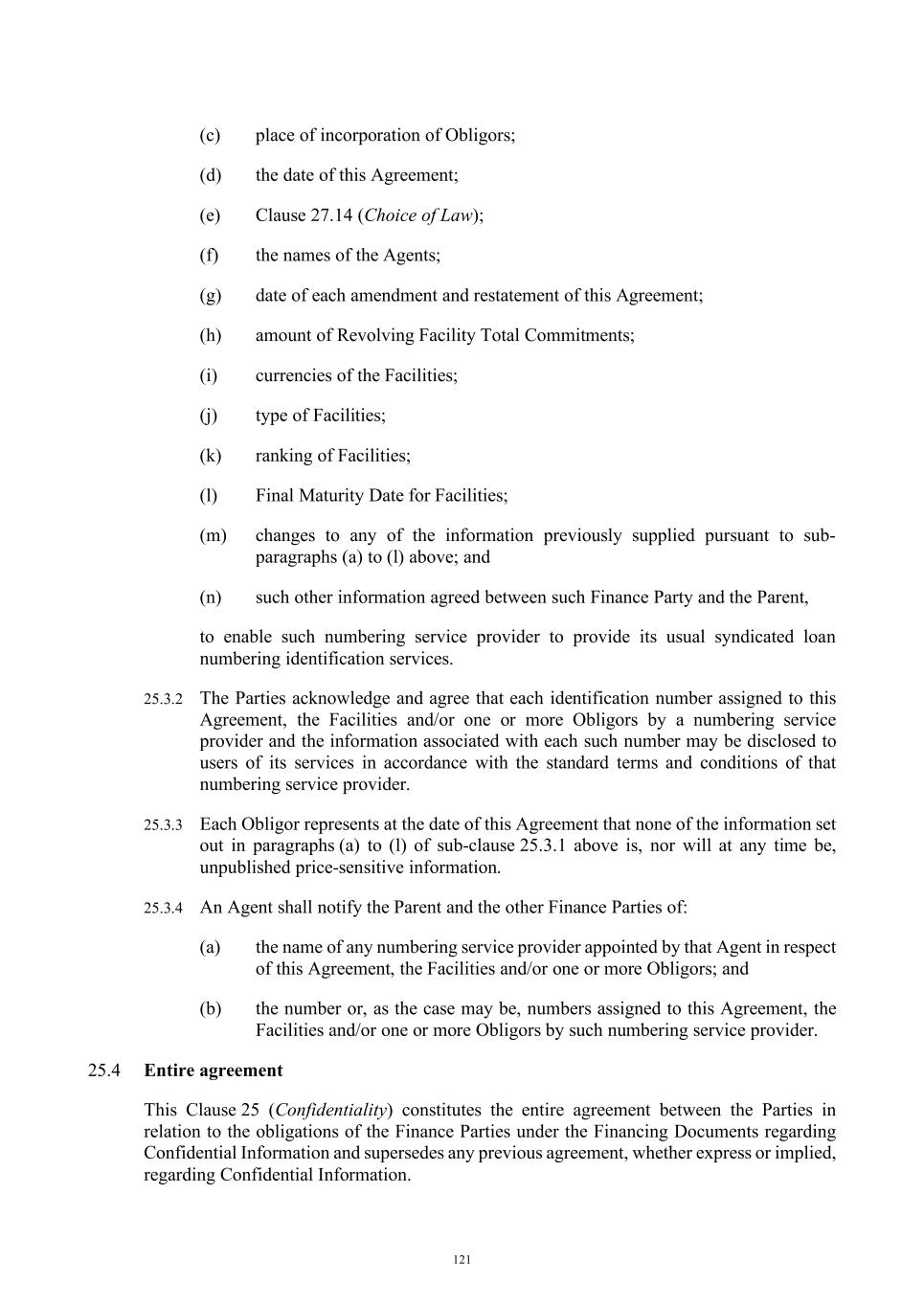 121 (c) place of incorporation of Obligors; (d) the date of this Agreement; (e) Clause 27.14 (Choice of Law); (f) the names of the Agents; (g) date of each amendment and restatement of this Agreement; (h) amount of Revolving Facility Total Commitments; (i) currencies of the Facilities; (j) type of Facilities; (k) ranking of Facilities; (l) Final Maturity Date for Facilities; (m) changes to any of the information previously supplied pursuant to sub- paragraphs (a) to (l) above; and (n) such other information agreed between such Finance Party and the Parent, to enable such numbering service provider to provide its usual syndicated loan numbering identification services. 25.3.2 The Parties acknowledge and agree that each identification number assigned to this Agreement, the Facilities and/or one or more Obligors by a numbering service provider and the information associated with each such number may be disclosed to users of its services in accordance with the standard terms and conditions of that numbering service provider. 25.3.3 Each Obligor represents at the date of this Agreement that none of the information set out in paragraphs (a) to (l) of sub-clause 25.3.1 above is, nor will at any time be, unpublished price-sensitive information. 25.3.4 An Agent shall notify the Parent and the other Finance Parties of: (a) the name of any numbering service provider appointed by that Agent in respect of this Agreement, the Facilities and/or one or more Obligors; and (b) the number or, as the case may be, numbers assigned to this Agreement, the Facilities and/or one or more Obligors by such numbering service provider. 25.4 Entire agreement This Clause 25 (Confidentiality) constitutes the entire agreement between the Parties in relation to the obligations of the Finance Parties under the Financing Documents regarding Confidential Information and supersedes any previous agreement, whether express or implied, regarding Confidential Information.