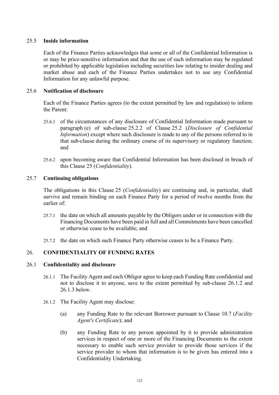 122 25.5 Inside information Each of the Finance Parties acknowledges that some or all of the Confidential Information is or may be price-sensitive information and that the use of such information may be regulated or prohibited by applicable legislation including securities law relating to insider dealing and market abuse and each of the Finance Parties undertakes not to use any Confidential Information for any unlawful purpose. 25.6 Notification of disclosure Each of the Finance Parties agrees (to the extent permitted by law and regulation) to inform the Parent: 25.6.1 of the circumstances of any disclosure of Confidential Information made pursuant to paragraph (e) of sub-clause 25.2.2 of Clause 25.2 (Disclosure of Confidential Information) except where such disclosure is made to any of the persons referred to in that sub-clause during the ordinary course of its supervisory or regulatory function; and 25.6.2 upon becoming aware that Confidential Information has been disclosed in breach of this Clause 25 (Confidentiality). 25.7 Continuing obligations The obligations in this Clause 25 (Confidentiality) are continuing and, in particular, shall survive and remain binding on each Finance Party for a period of twelve months from the earlier of: 25.7.1 the date on which all amounts payable by the Obligors under or in connection with the Financing Documents have been paid in full and all Commitments have been cancelled or otherwise cease to be available; and 25.7.2 the date on which such Finance Party otherwise ceases to be a Finance Party. 26. CONFIDENTIALITY OF FUNDING RATES 26.1 Confidentiality and disclosure 26.1.1 The Facility Agent and each Obligor agree to keep each Funding Rate confidential and not to disclose it to anyone, save to the extent permitted by sub-clause 26.1.2 and 26.1.3 below. 26.1.2 The Facility Agent may disclose: (a) any Funding Rate to the relevant Borrower pursuant to Clause 10.7 (Facility Agent's Certificate); and (b) any Funding Rate to any person appointed by it to provide administration services in respect of one or more of the Financing Documents to the extent necessary to enable such service provider to provide those services if the service provider to whom that information is to be given has entered into a Confidentiality Undertaking.