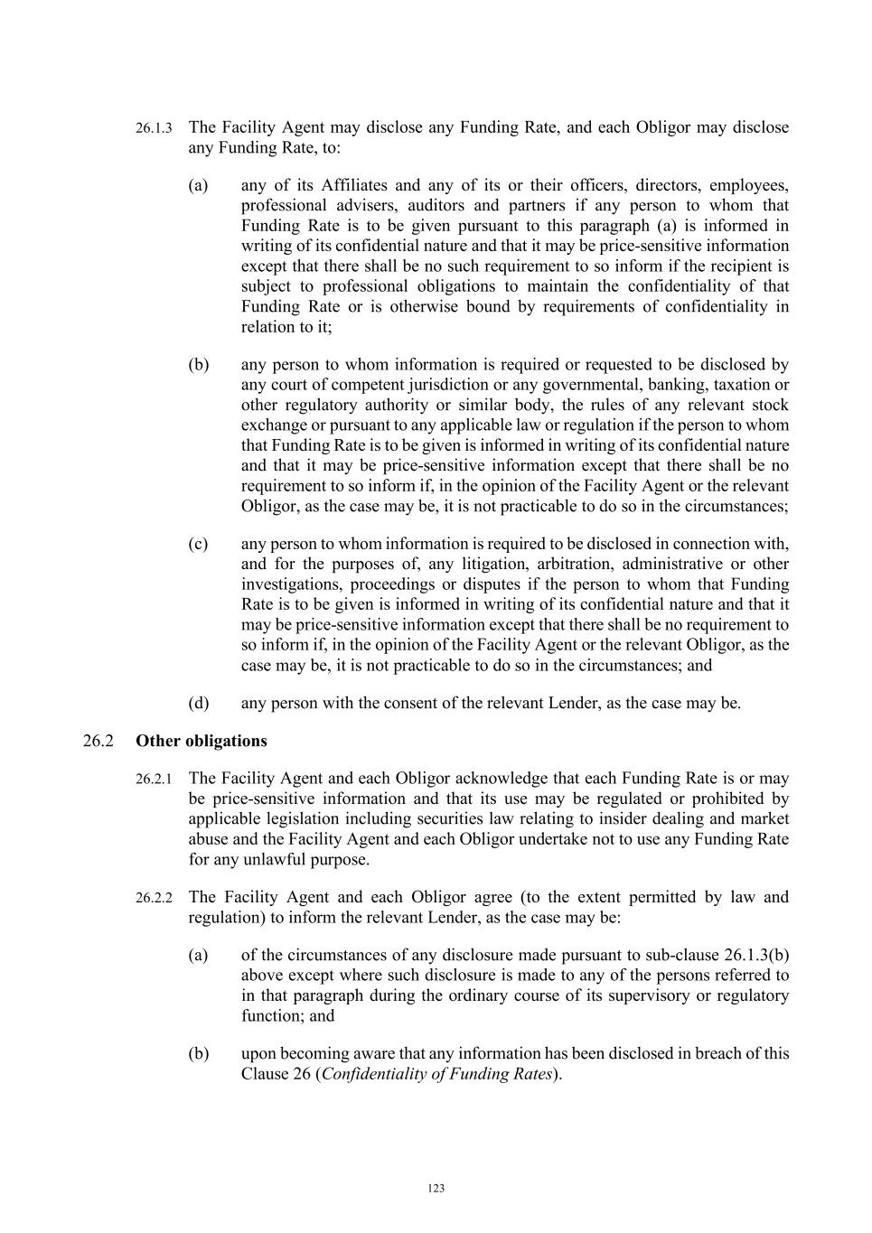 123 26.1.3 The Facility Agent may disclose any Funding Rate, and each Obligor may disclose any Funding Rate, to: (a) any of its Affiliates and any of its or their officers, directors, employees, professional advisers, auditors and partners if any person to whom that Funding Rate is to be given pursuant to this paragraph (a) is informed in writing of its confidential nature and that it may be price-sensitive information except that there shall be no such requirement to so inform if the recipient is subject to professional obligations to maintain the confidentiality of that Funding Rate or is otherwise bound by requirements of confidentiality in relation to it; (b) any person to whom information is required or requested to be disclosed by any court of competent jurisdiction or any governmental, banking, taxation or other regulatory authority or similar body, the rules of any relevant stock exchange or pursuant to any applicable law or regulation if the person to whom that Funding Rate is to be given is informed in writing of its confidential nature and that it may be price-sensitive information except that there shall be no requirement to so inform if, in the opinion of the Facility Agent or the relevant Obligor, as the case may be, it is not practicable to do so in the circumstances; (c) any person to whom information is required to be disclosed in connection with, and for the purposes of, any litigation, arbitration, administrative or other investigations, proceedings or disputes if the person to whom that Funding Rate is to be given is informed in writing of its confidential nature and that it may be price-sensitive information except that there shall be no requirement to so inform if, in the opinion of the Facility Agent or the relevant Obligor, as the case may be, it is not practicable to do so in the circumstances; and (d) any person with the consent of the relevant Lender, as the case may be. 26.2 Other obligations 26.2.1 The Facility Agent and each Obligor acknowledge that each Funding Rate is or may be price-sensitive information and that its use may be regulated or prohibited by applicable legislation including securities law relating to insider dealing and market abuse and the Facility Agent and each Obligor undertake not to use any Funding Rate for any unlawful purpose. 26.2.2 The Facility Agent and each Obligor agree (to the extent permitted by law and regulation) to inform the relevant Lender, as the case may be: (a) of the circumstances of any disclosure made pursuant to sub-clause 26.1.3(b) above except where such disclosure is made to any of the persons referred to in that paragraph during the ordinary course of its supervisory or regulatory function; and (b) upon becoming aware that any information has been disclosed in breach of this Clause 26 (Confidentiality of Funding Rates).