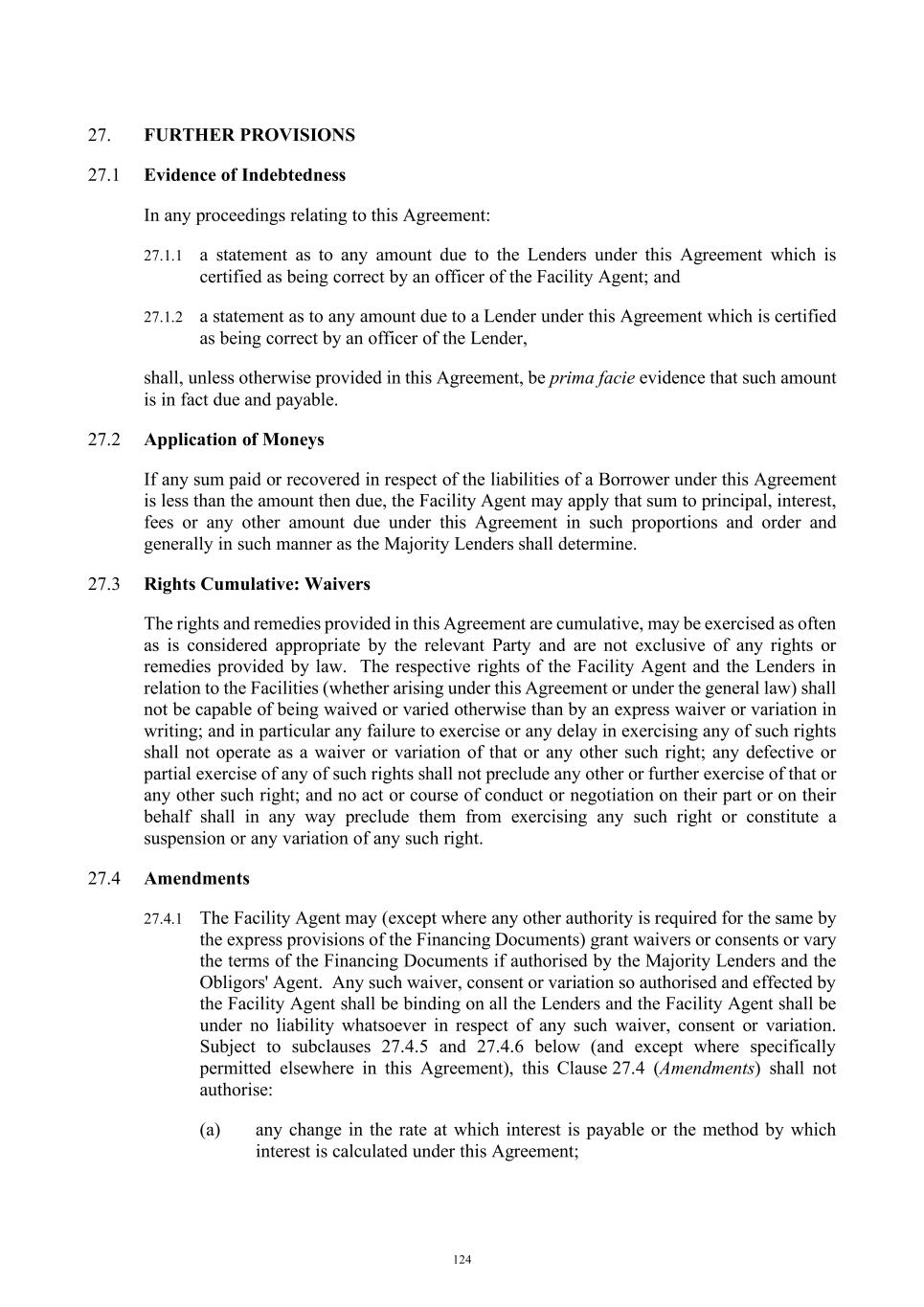 124 27. FURTHER PROVISIONS 27.1 Evidence of Indebtedness In any proceedings relating to this Agreement: 27.1.1 a statement as to any amount due to the Lenders under this Agreement which is certified as being correct by an officer of the Facility Agent; and 27.1.2 a statement as to any amount due to a Lender under this Agreement which is certified as being correct by an officer of the Lender, shall, unless otherwise provided in this Agreement, be prima facie evidence that such amount is in fact due and payable. 27.2 Application of Moneys If any sum paid or recovered in respect of the liabilities of a Borrower under this Agreement is less than the amount then due, the Facility Agent may apply that sum to principal, interest, fees or any other amount due under this Agreement in such proportions and order and generally in such manner as the Majority Lenders shall determine. 27.3 Rights Cumulative: Waivers The rights and remedies provided in this Agreement are cumulative, may be exercised as often as is considered appropriate by the relevant Party and are not exclusive of any rights or remedies provided by law. The respective rights of the Facility Agent and the Lenders in relation to the Facilities (whether arising under this Agreement or under the general law) shall not be capable of being waived or varied otherwise than by an express waiver or variation in writing; and in particular any failure to exercise or any delay in exercising any of such rights shall not operate as a waiver or variation of that or any other such right; any defective or partial exercise of any of such rights shall not preclude any other or further exercise of that or any other such right; and no act or course of conduct or negotiation on their part or on their behalf shall in any way preclude them from exercising any such right or constitute a suspension or any variation of any such right. 27.4 Amendments 27.4.1 The Facility Agent may (except where any other authority is required for the same by the express provisions of the Financing Documents) grant waivers or consents or vary the terms of the Financing Documents if authorised by the Majority Lenders and the Obligors' Agent. Any such waiver, consent or variation so authorised and effected by the Facility Agent shall be binding on all the Lenders and the Facility Agent shall be under no liability whatsoever in respect of any such waiver, consent or variation. Subject to subclauses 27.4.5 and 27.4.6 below (and except where specifically permitted elsewhere in this Agreement), this Clause 27.4 (Amendments) shall not authorise: (a) any change in the rate at which interest is payable or the method by which interest is calculated under this Agreement;
