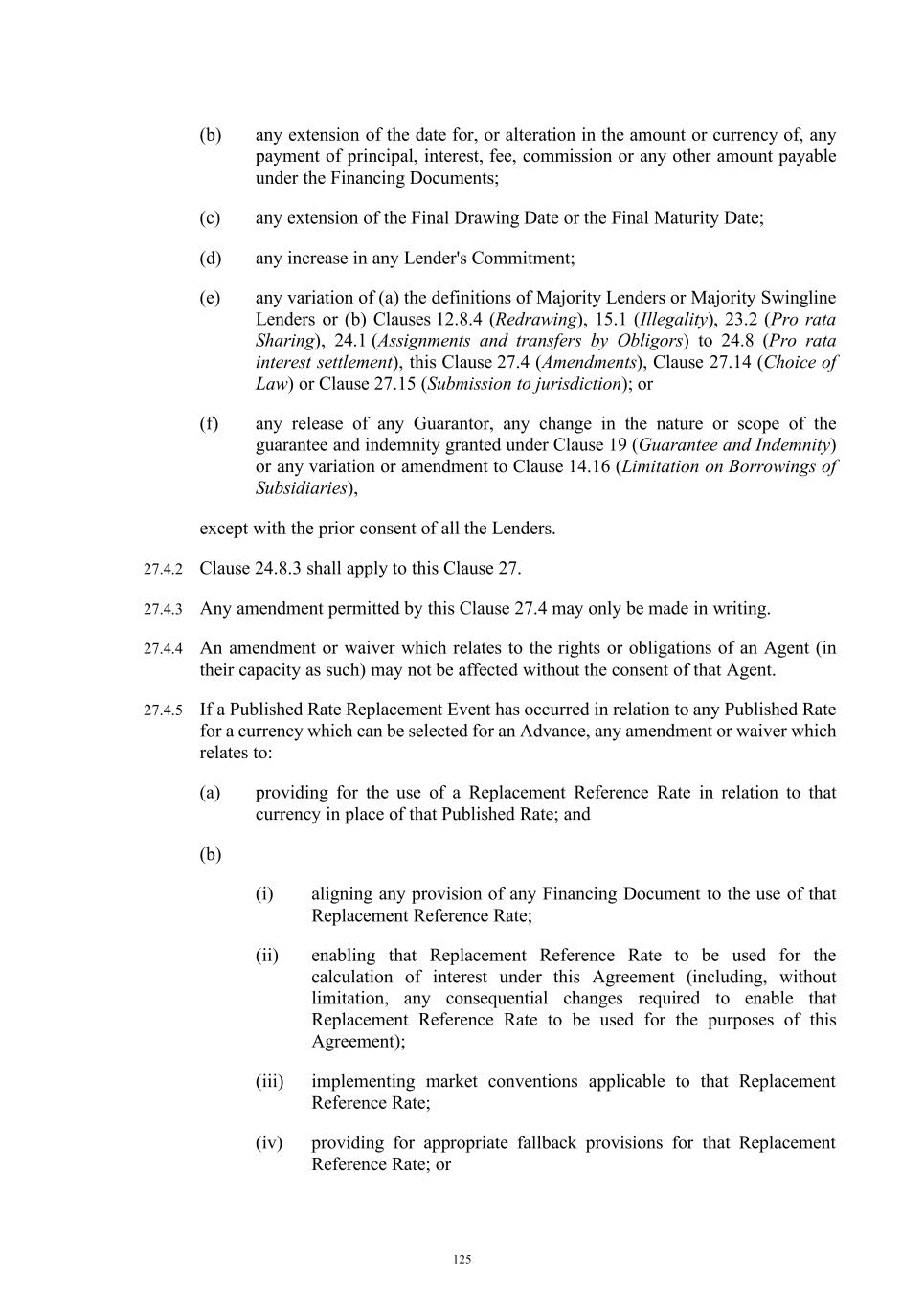 125 (b) any extension of the date for, or alteration in the amount or currency of, any payment of principal, interest, fee, commission or any other amount payable under the Financing Documents; (c) any extension of the Final Drawing Date or the Final Maturity Date; (d) any increase in any Lender's Commitment; (e) any variation of (a) the definitions of Majority Lenders or Majority Swingline Lenders or (b) Clauses 12.8.4 (Redrawing), 15.1 (Illegality), 23.2 (Pro rata Sharing), 24.1 (Assignments and transfers by Obligors) to 24.8 (Pro rata interest settlement), this Clause 27.4 (Amendments), Clause 27.14 (Choice of Law) or Clause 27.15 (Submission to jurisdiction); or (f) any release of any Guarantor, any change in the nature or scope of the guarantee and indemnity granted under Clause 19 (Guarantee and Indemnity) or any variation or amendment to Clause 14.16 (Limitation on Borrowings of Subsidiaries), except with the prior consent of all the Lenders. 27.4.2 Clause 24.8.3 shall apply to this Clause 27. 27.4.3 Any amendment permitted by this Clause 27.4 may only be made in writing. 27.4.4 An amendment or waiver which relates to the rights or obligations of an Agent (in their capacity as such) may not be affected without the consent of that Agent. 27.4.5 If a Published Rate Replacement Event has occurred in relation to any Published Rate for a currency which can be selected for an Advance, any amendment or waiver which relates to: (a) providing for the use of a Replacement Reference Rate in relation to that currency in place of that Published Rate; and (b) (i) aligning any provision of any Financing Document to the use of that Replacement Reference Rate; (ii) enabling that Replacement Reference Rate to be used for the calculation of interest under this Agreement (including, without limitation, any consequential changes required to enable that Replacement Reference Rate to be used for the purposes of this Agreement); (iii) implementing market conventions applicable to that Replacement Reference Rate; (iv) providing for appropriate fallback provisions for that Replacement Reference Rate; or