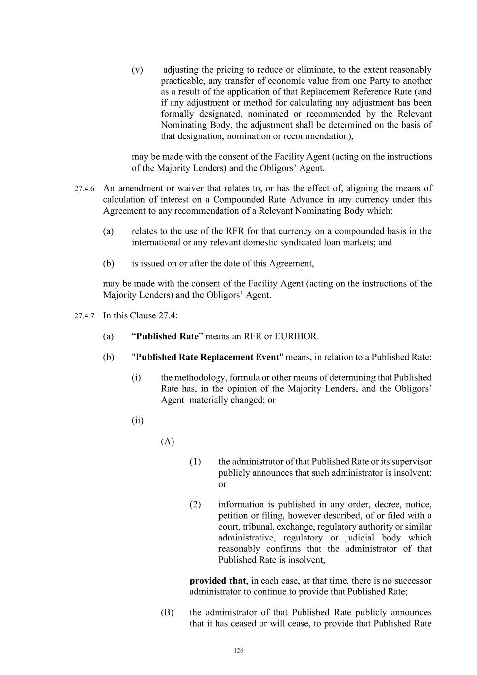 126 (v) adjusting the pricing to reduce or eliminate, to the extent reasonably practicable, any transfer of economic value from one Party to another as a result of the application of that Replacement Reference Rate (and if any adjustment or method for calculating any adjustment has been formally designated, nominated or recommended by the Relevant Nominating Body, the adjustment shall be determined on the basis of that designation, nomination or recommendation), may be made with the consent of the Facility Agent (acting on the instructions of the Majority Lenders) and the Obligors’ Agent. 27.4.6 An amendment or waiver that relates to, or has the effect of, aligning the means of calculation of interest on a Compounded Rate Advance in any currency under this Agreement to any recommendation of a Relevant Nominating Body which: (a) relates to the use of the RFR for that currency on a compounded basis in the international or any relevant domestic syndicated loan markets; and (b) is issued on or after the date of this Agreement, may be made with the consent of the Facility Agent (acting on the instructions of the Majority Lenders) and the Obligors’ Agent. 27.4.7 In this Clause 27.4: (a) “Published Rate” means an RFR or EURIBOR. (b) "Published Rate Replacement Event" means, in relation to a Published Rate: (i) the methodology, formula or other means of determining that Published Rate has, in the opinion of the Majority Lenders, and the Obligors’ Agent materially changed; or (ii) (A) (1) the administrator of that Published Rate or its supervisor publicly announces that such administrator is insolvent; or (2) information is published in any order, decree, notice, petition or filing, however described, of or filed with a court, tribunal, exchange, regulatory authority or similar administrative, regulatory or judicial body which reasonably confirms that the administrator of that Published Rate is insolvent, provided that, in each case, at that time, there is no successor administrator to continue to provide that Published Rate; (B) the administrator of that Published Rate publicly announces that it has ceased or will cease, to provide that Published Rate