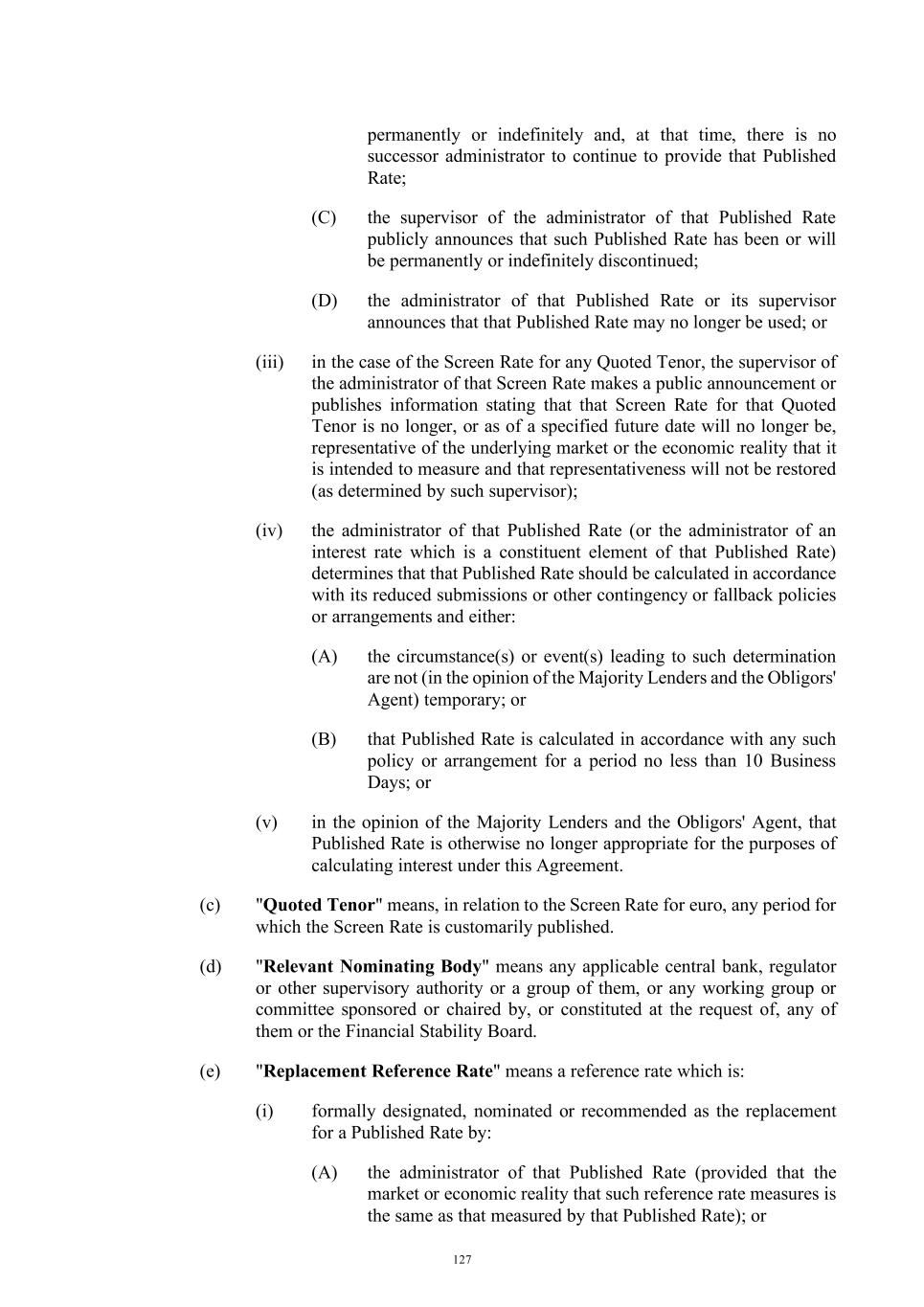 127 permanently or indefinitely and, at that time, there is no successor administrator to continue to provide that Published Rate; (C) the supervisor of the administrator of that Published Rate publicly announces that such Published Rate has been or will be permanently or indefinitely discontinued; (D) the administrator of that Published Rate or its supervisor announces that that Published Rate may no longer be used; or (iii) in the case of the Screen Rate for any Quoted Tenor, the supervisor of the administrator of that Screen Rate makes a public announcement or publishes information stating that that Screen Rate for that Quoted Tenor is no longer, or as of a specified future date will no longer be, representative of the underlying market or the economic reality that it is intended to measure and that representativeness will not be restored (as determined by such supervisor); (iv) the administrator of that Published Rate (or the administrator of an interest rate which is a constituent element of that Published Rate) determines that that Published Rate should be calculated in accordance with its reduced submissions or other contingency or fallback policies or arrangements and either: (A) the circumstance(s) or event(s) leading to such determination are not (in the opinion of the Majority Lenders and the Obligors' Agent) temporary; or (B) that Published Rate is calculated in accordance with any such policy or arrangement for a period no less than 10 Business Days; or (v) in the opinion of the Majority Lenders and the Obligors' Agent, that Published Rate is otherwise no longer appropriate for the purposes of calculating interest under this Agreement. (c) "Quoted Tenor" means, in relation to the Screen Rate for euro, any period for which the Screen Rate is customarily published. (d) "Relevant Nominating Body" means any applicable central bank, regulator or other supervisory authority or a group of them, or any working group or committee sponsored or chaired by, or constituted at the request of, any of them or the Financial Stability Board. (e) "Replacement Reference Rate" means a reference rate which is: (i) formally designated, nominated or recommended as the replacement for a Published Rate by: (A) the administrator of that Published Rate (provided that the market or economic reality that such reference rate measures is the same as that measured by that Published Rate); or