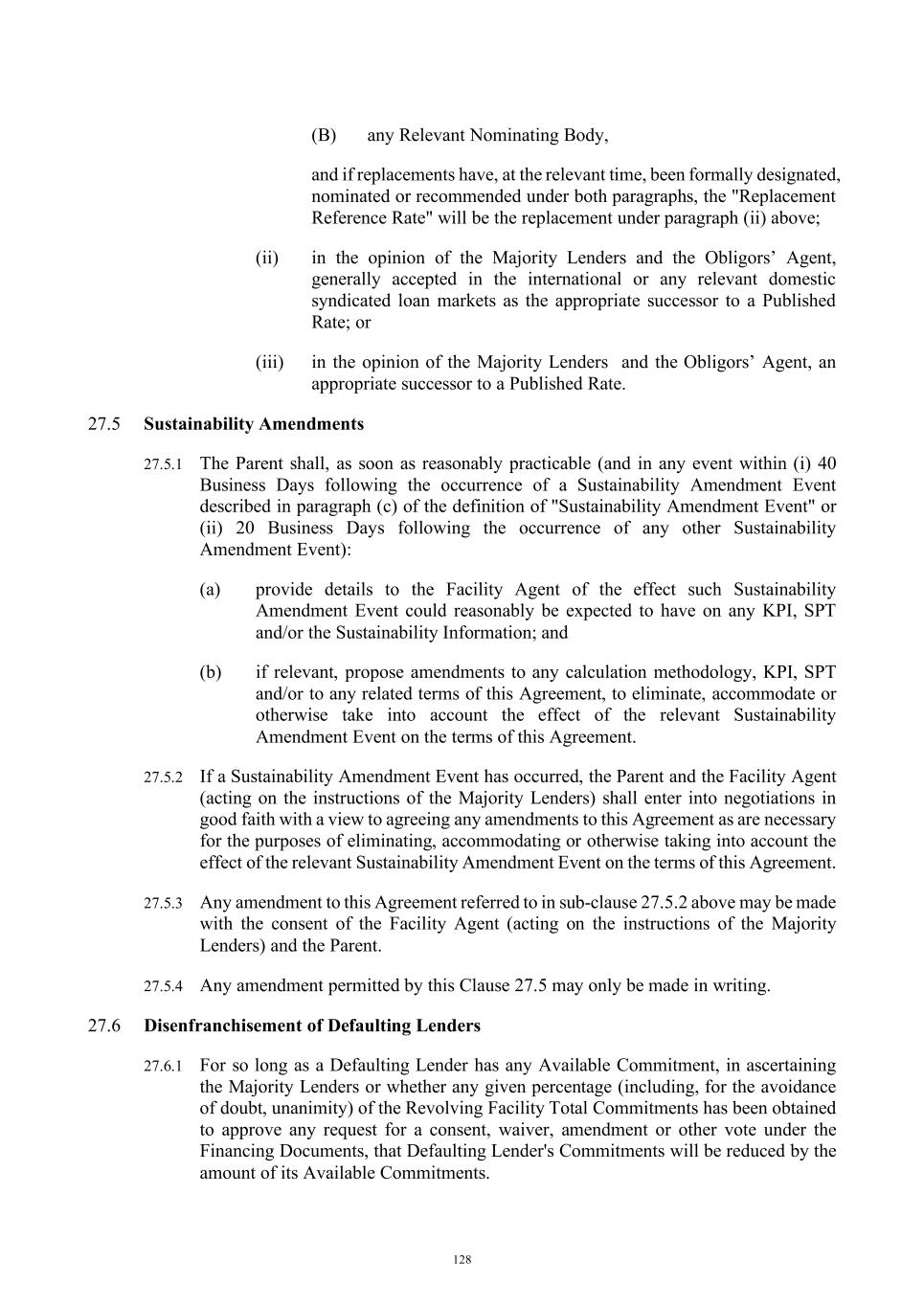 128 (B) any Relevant Nominating Body, and if replacements have, at the relevant time, been formally designated, nominated or recommended under both paragraphs, the "Replacement Reference Rate" will be the replacement under paragraph (ii) above; (ii) in the opinion of the Majority Lenders and the Obligors’ Agent, generally accepted in the international or any relevant domestic syndicated loan markets as the appropriate successor to a Published Rate; or (iii) in the opinion of the Majority Lenders and the Obligors’ Agent, an appropriate successor to a Published Rate. 27.5 Sustainability Amendments 27.5.1 The Parent shall, as soon as reasonably practicable (and in any event within (i) 40 Business Days following the occurrence of a Sustainability Amendment Event described in paragraph (c) of the definition of "Sustainability Amendment Event" or (ii) 20 Business Days following the occurrence of any other Sustainability Amendment Event): (a) provide details to the Facility Agent of the effect such Sustainability Amendment Event could reasonably be expected to have on any KPI, SPT and/or the Sustainability Information; and (b) if relevant, propose amendments to any calculation methodology, KPI, SPT and/or to any related terms of this Agreement, to eliminate, accommodate or otherwise take into account the effect of the relevant Sustainability Amendment Event on the terms of this Agreement. 27.5.2 If a Sustainability Amendment Event has occurred, the Parent and the Facility Agent (acting on the instructions of the Majority Lenders) shall enter into negotiations in good faith with a view to agreeing any amendments to this Agreement as are necessary for the purposes of eliminating, accommodating or otherwise taking into account the effect of the relevant Sustainability Amendment Event on the terms of this Agreement. 27.5.3 Any amendment to this Agreement referred to in sub-clause 27.5.2 above may be made with the consent of the Facility Agent (acting on the instructions of the Majority Lenders) and the Parent. 27.5.4 Any amendment permitted by this Clause 27.5 may only be made in writing. 27.6 Disenfranchisement of Defaulting Lenders 27.6.1 For so long as a Defaulting Lender has any Available Commitment, in ascertaining the Majority Lenders or whether any given percentage (including, for the avoidance of doubt, unanimity) of the Revolving Facility Total Commitments has been obtained to approve any request for a consent, waiver, amendment or other vote under the Financing Documents, that Defaulting Lender's Commitments will be reduced by the amount of its Available Commitments.