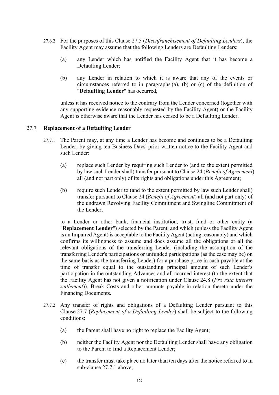129 27.6.2 For the purposes of this Clause 27.5 (Disenfranchisement of Defaulting Lenders), the Facility Agent may assume that the following Lenders are Defaulting Lenders: (a) any Lender which has notified the Facility Agent that it has become a Defaulting Lender; (b) any Lender in relation to which it is aware that any of the events or circumstances referred to in paragraphs (a), (b) or (c) of the definition of "Defaulting Lender" has occurred, unless it has received notice to the contrary from the Lender concerned (together with any supporting evidence reasonably requested by the Facility Agent) or the Facility Agent is otherwise aware that the Lender has ceased to be a Defaulting Lender. 27.7 Replacement of a Defaulting Lender 27.7.1 The Parent may, at any time a Lender has become and continues to be a Defaulting Lender, by giving ten Business Days' prior written notice to the Facility Agent and such Lender: (a) replace such Lender by requiring such Lender to (and to the extent permitted by law such Lender shall) transfer pursuant to Clause 24 (Benefit of Agreement) all (and not part only) of its rights and obligations under this Agreement; (b) require such Lender to (and to the extent permitted by law such Lender shall) transfer pursuant to Clause 24 (Benefit of Agreement) all (and not part only) of the undrawn Revolving Facility Commitment and Swingline Commitment of the Lender, to a Lender or other bank, financial institution, trust, fund or other entity (a "Replacement Lender") selected by the Parent, and which (unless the Facility Agent is an Impaired Agent) is acceptable to the Facility Agent (acting reasonably) and which confirms its willingness to assume and does assume all the obligations or all the relevant obligations of the transferring Lender (including the assumption of the transferring Lender's participations or unfunded participations (as the case may be) on the same basis as the transferring Lender) for a purchase price in cash payable at the time of transfer equal to the outstanding principal amount of such Lender's participation in the outstanding Advances and all accrued interest (to the extent that the Facility Agent has not given a notification under Clause 24.8 (Pro rata interest settlement)), Break Costs and other amounts payable in relation thereto under the Financing Documents. 27.7.2 Any transfer of rights and obligations of a Defaulting Lender pursuant to this Clause 27.7 (Replacement of a Defaulting Lender) shall be subject to the following conditions: (a) the Parent shall have no right to replace the Facility Agent; (b) neither the Facility Agent nor the Defaulting Lender shall have any obligation to the Parent to find a Replacement Lender; (c) the transfer must take place no later than ten days after the notice referred to in sub-clause 27.7.1 above;