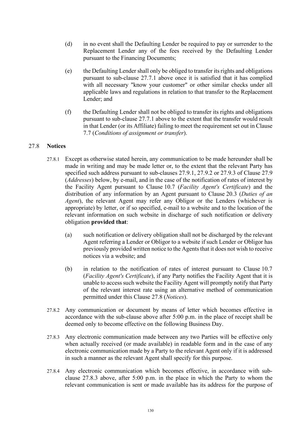 130 (d) in no event shall the Defaulting Lender be required to pay or surrender to the Replacement Lender any of the fees received by the Defaulting Lender pursuant to the Financing Documents; (e) the Defaulting Lender shall only be obliged to transfer its rights and obligations pursuant to sub-clause 27.7.1 above once it is satisfied that it has complied with all necessary "know your customer" or other similar checks under all applicable laws and regulations in relation to that transfer to the Replacement Lender; and (f) the Defaulting Lender shall not be obliged to transfer its rights and obligations pursuant to sub-clause 27.7.1 above to the extent that the transfer would result in that Lender (or its Affiliate) failing to meet the requirement set out in Clause 7.7 (Conditions of assignment or transfer). 27.8 Notices 27.8.1 Except as otherwise stated herein, any communication to be made hereunder shall be made in writing and may be made letter or, to the extent that the relevant Party has specified such address pursuant to sub-clauses 27.9.1, 27.9.2 or 27.9.3 of Clause 27.9 (Addresses) below, by e-mail, and in the case of the notification of rates of interest by the Facility Agent pursuant to Clause 10.7 (Facility Agent's Certificate) and the distribution of any information by an Agent pursuant to Clause 20.3 (Duties of an Agent), the relevant Agent may refer any Obligor or the Lenders (whichever is appropriate) by letter, or if so specified, e-mail to a website and to the location of the relevant information on such website in discharge of such notification or delivery obligation provided that: (a) such notification or delivery obligation shall not be discharged by the relevant Agent referring a Lender or Obligor to a website if such Lender or Obligor has previously provided written notice to the Agents that it does not wish to receive notices via a website; and (b) in relation to the notification of rates of interest pursuant to Clause 10.7 (Facility Agent's Certificate), if any Party notifies the Facility Agent that it is unable to access such website the Facility Agent will promptly notify that Party of the relevant interest rate using an alternative method of communication permitted under this Clause 27.8 (Notices). 27.8.2 Any communication or document by means of letter which becomes effective in accordance with the sub-clause above after 5:00 p.m. in the place of receipt shall be deemed only to become effective on the following Business Day. 27.8.3 Any electronic communication made between any two Parties will be effective only when actually received (or made available) in readable form and in the case of any electronic communication made by a Party to the relevant Agent only if it is addressed in such a manner as the relevant Agent shall specify for this purpose. 27.8.4 Any electronic communication which becomes effective, in accordance with sub- clause 27.8.3 above, after 5:00 p.m. in the place in which the Party to whom the relevant communication is sent or made available has its address for the purpose of