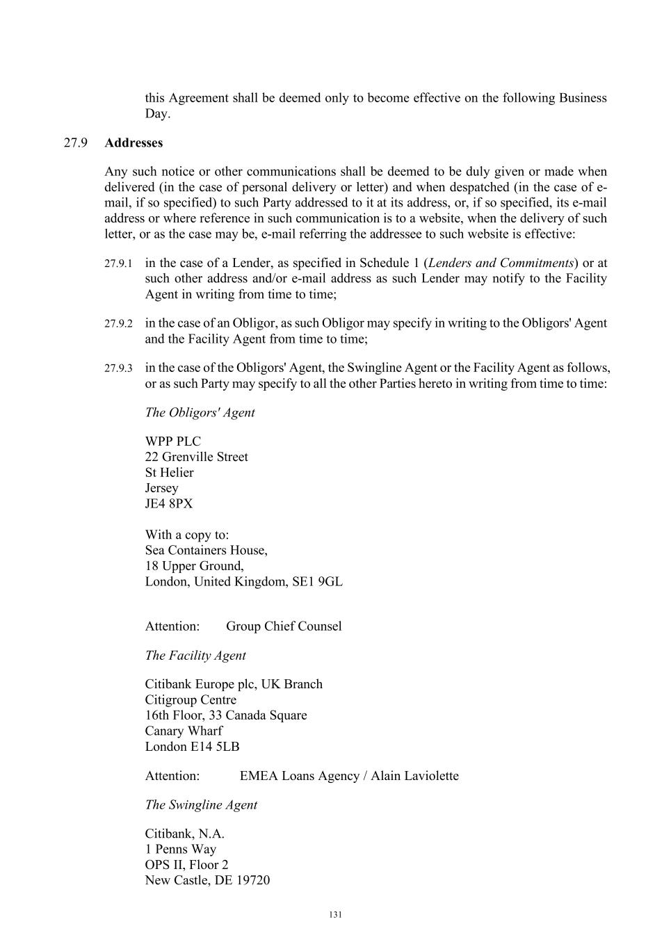 131 this Agreement shall be deemed only to become effective on the following Business Day. 27.9 Addresses Any such notice or other communications shall be deemed to be duly given or made when delivered (in the case of personal delivery or letter) and when despatched (in the case of e- mail, if so specified) to such Party addressed to it at its address, or, if so specified, its e-mail address or where reference in such communication is to a website, when the delivery of such letter, or as the case may be, e-mail referring the addressee to such website is effective: 27.9.1 in the case of a Lender, as specified in Schedule 1 (Lenders and Commitments) or at such other address and/or e-mail address as such Lender may notify to the Facility Agent in writing from time to time; 27.9.2 in the case of an Obligor, as such Obligor may specify in writing to the Obligors' Agent and the Facility Agent from time to time; 27.9.3 in the case of the Obligors' Agent, the Swingline Agent or the Facility Agent as follows, or as such Party may specify to all the other Parties hereto in writing from time to time: The Obligors' Agent WPP PLC 22 Grenville Street St Helier Jersey JE4 8PX With a copy to: Sea Containers House, 18 Upper Ground, London, United Kingdom, SE1 9GL Attention: Group Chief Counsel The Facility Agent Citibank Europe plc, UK Branch Citigroup Centre 16th Floor, 33 Canada Square Canary Wharf London E14 5LB Attention: EMEA Loans Agency / Alain Laviolette The Swingline Agent Citibank, N.A. 1 Penns Way OPS II, Floor 2 New Castle, DE 19720