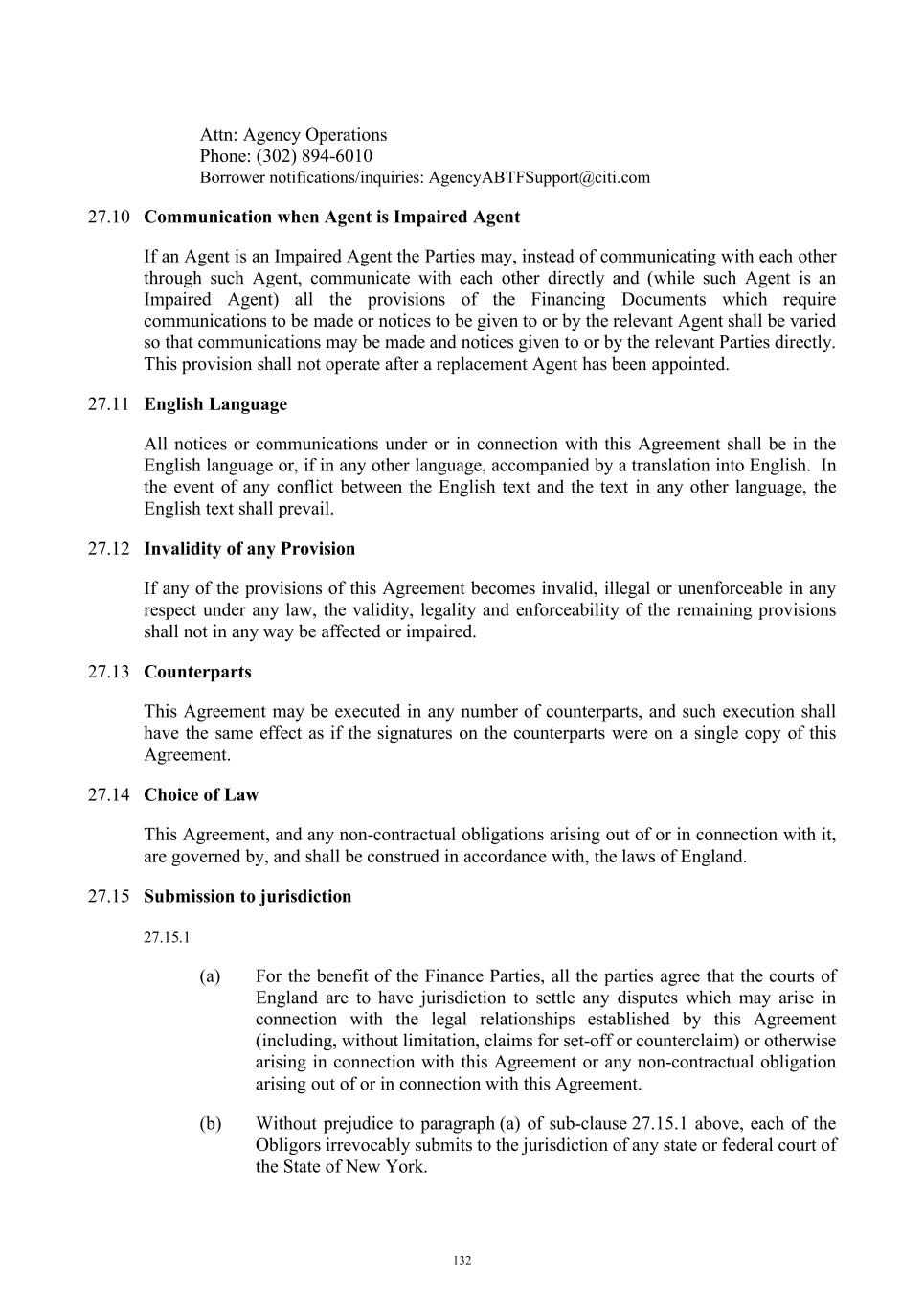 132 Attn: Agency Operations Phone: (302) 894-6010 Borrower notifications/inquiries: AgencyABTFSupport@citi.com 27.10 Communication when Agent is Impaired Agent If an Agent is an Impaired Agent the Parties may, instead of communicating with each other through such Agent, communicate with each other directly and (while such Agent is an Impaired Agent) all the provisions of the Financing Documents which require communications to be made or notices to be given to or by the relevant Agent shall be varied so that communications may be made and notices given to or by the relevant Parties directly. This provision shall not operate after a replacement Agent has been appointed. 27.11 English Language All notices or communications under or in connection with this Agreement shall be in the English language or, if in any other language, accompanied by a translation into English. In the event of any conflict between the English text and the text in any other language, the English text shall prevail. 27.12 Invalidity of any Provision If any of the provisions of this Agreement becomes invalid, illegal or unenforceable in any respect under any law, the validity, legality and enforceability of the remaining provisions shall not in any way be affected or impaired. 27.13 Counterparts This Agreement may be executed in any number of counterparts, and such execution shall have the same effect as if the signatures on the counterparts were on a single copy of this Agreement. 27.14 Choice of Law This Agreement, and any non-contractual obligations arising out of or in connection with it, are governed by, and shall be construed in accordance with, the laws of England. 27.15 Submission to jurisdiction 27.15.1 (a) For the benefit of the Finance Parties, all the parties agree that the courts of England are to have jurisdiction to settle any disputes which may arise in connection with the legal relationships established by this Agreement (including, without limitation, claims for set-off or counterclaim) or otherwise arising in connection with this Agreement or any non-contractual obligation arising out of or in connection with this Agreement. (b) Without prejudice to paragraph (a) of sub-clause 27.15.1 above, each of the Obligors irrevocably submits to the jurisdiction of any state or federal court of the State of New York.