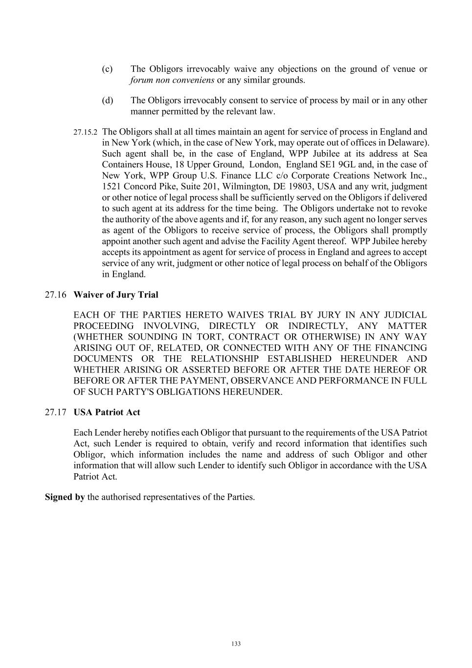 133 (c) The Obligors irrevocably waive any objections on the ground of venue or forum non conveniens or any similar grounds. (d) The Obligors irrevocably consent to service of process by mail or in any other manner permitted by the relevant law. 27.15.2 The Obligors shall at all times maintain an agent for service of process in England and in New York (which, in the case of New York, may operate out of offices in Delaware). Such agent shall be, in the case of England, WPP Jubilee at its address at Sea Containers House, 18 Upper Ground, London, England SE1 9GL and, in the case of New York, WPP Group U.S. Finance LLC c/o Corporate Creations Network Inc., 1521 Concord Pike, Suite 201, Wilmington, DE 19803, USA and any writ, judgment or other notice of legal process shall be sufficiently served on the Obligors if delivered to such agent at its address for the time being. The Obligors undertake not to revoke the authority of the above agents and if, for any reason, any such agent no longer serves as agent of the Obligors to receive service of process, the Obligors shall promptly appoint another such agent and advise the Facility Agent thereof. WPP Jubilee hereby accepts its appointment as agent for service of process in England and agrees to accept service of any writ, judgment or other notice of legal process on behalf of the Obligors in England. 27.16 Waiver of Jury Trial EACH OF THE PARTIES HERETO WAIVES TRIAL BY JURY IN ANY JUDICIAL PROCEEDING INVOLVING, DIRECTLY OR INDIRECTLY, ANY MATTER (WHETHER SOUNDING IN TORT, CONTRACT OR OTHERWISE) IN ANY WAY ARISING OUT OF, RELATED, OR CONNECTED WITH ANY OF THE FINANCING DOCUMENTS OR THE RELATIONSHIP ESTABLISHED HEREUNDER AND WHETHER ARISING OR ASSERTED BEFORE OR AFTER THE DATE HEREOF OR BEFORE OR AFTER THE PAYMENT, OBSERVANCE AND PERFORMANCE IN FULL OF SUCH PARTY'S OBLIGATIONS HEREUNDER. 27.17 USA Patriot Act Each Lender hereby notifies each Obligor that pursuant to the requirements of the USA Patriot Act, such Lender is required to obtain, verify and record information that identifies such Obligor, which information includes the name and address of such Obligor and other information that will allow such Lender to identify such Obligor in accordance with the USA Patriot Act. Signed by the authorised representatives of the Parties.