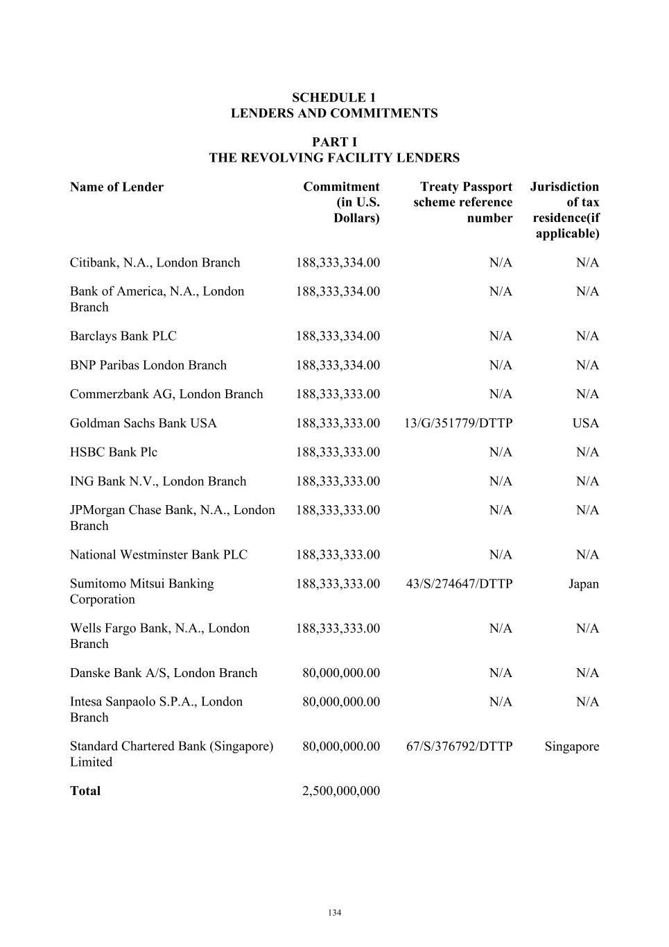 134 SCHEDULE 1 LENDERS AND COMMITMENTS PART I THE REVOLVING FACILITY LENDERS Name of Lender Commitment (in U.S. Dollars) Treaty Passport scheme reference number Jurisdiction of tax residence(if applicable) Citibank, N.A., London Branch 188,333,334.00 N/A N/A Bank of America, N.A., London Branch 188,333,334.00 N/A N/A Barclays Bank PLC 188,333,334.00 N/A N/A BNP Paribas London Branch 188,333,334.00 N/A N/A Commerzbank AG, London Branch 188,333,333.00 N/A N/A Goldman Sachs Bank USA 188,333,333.00 13/G/351779/DTTP USA HSBC Bank Plc 188,333,333.00 N/A N/A ING Bank N.V., London Branch 188,333,333.00 N/A N/A JPMorgan Chase Bank, N.A., London Branch 188,333,333.00 N/A N/A National Westminster Bank PLC 188,333,333.00 N/A N/A Sumitomo Mitsui Banking Corporation 188,333,333.00 43/S/274647/DTTP Japan Wells Fargo Bank, N.A., London Branch 188,333,333.00 N/A N/A Danske Bank A/S, London Branch 80,000,000.00 N/A N/A Intesa Sanpaolo S.P.A., London Branch 80,000,000.00 N/A N/A Standard Chartered Bank (Singapore) Limited 80,000,000.00 67/S/376792/DTTP Singapore Total 2,500,000,000