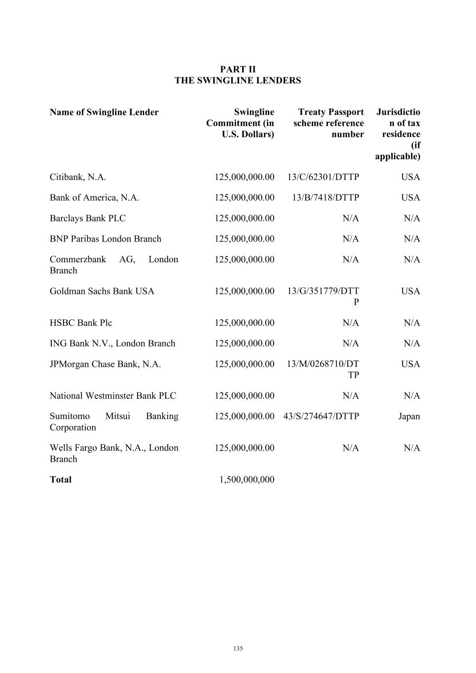 135 PART II THE SWINGLINE LENDERS Name of Swingline Lender Swingline Commitment (in U.S. Dollars) Treaty Passport scheme reference number Jurisdictio n of tax residence (if applicable) Citibank, N.A. 125,000,000.00 13/C/62301/DTTP USA Bank of America, N.A. 125,000,000.00 13/B/7418/DTTP USA Barclays Bank PLC 125,000,000.00 N/A N/A BNP Paribas London Branch 125,000,000.00 N/A N/A Commerzbank AG, London Branch 125,000,000.00 N/A N/A Goldman Sachs Bank USA 125,000,000.00 13/G/351779/DTT P USA HSBC Bank Plc 125,000,000.00 N/A N/A ING Bank N.V., London Branch 125,000,000.00 N/A N/A JPMorgan Chase Bank, N.A. 125,000,000.00 13/M/0268710/DT TP USA National Westminster Bank PLC 125,000,000.00 N/A N/A Sumitomo Mitsui Banking Corporation 125,000,000.00 43/S/274647/DTTP Japan Wells Fargo Bank, N.A., London Branch 125,000,000.00 N/A N/A Total 1,500,000,000