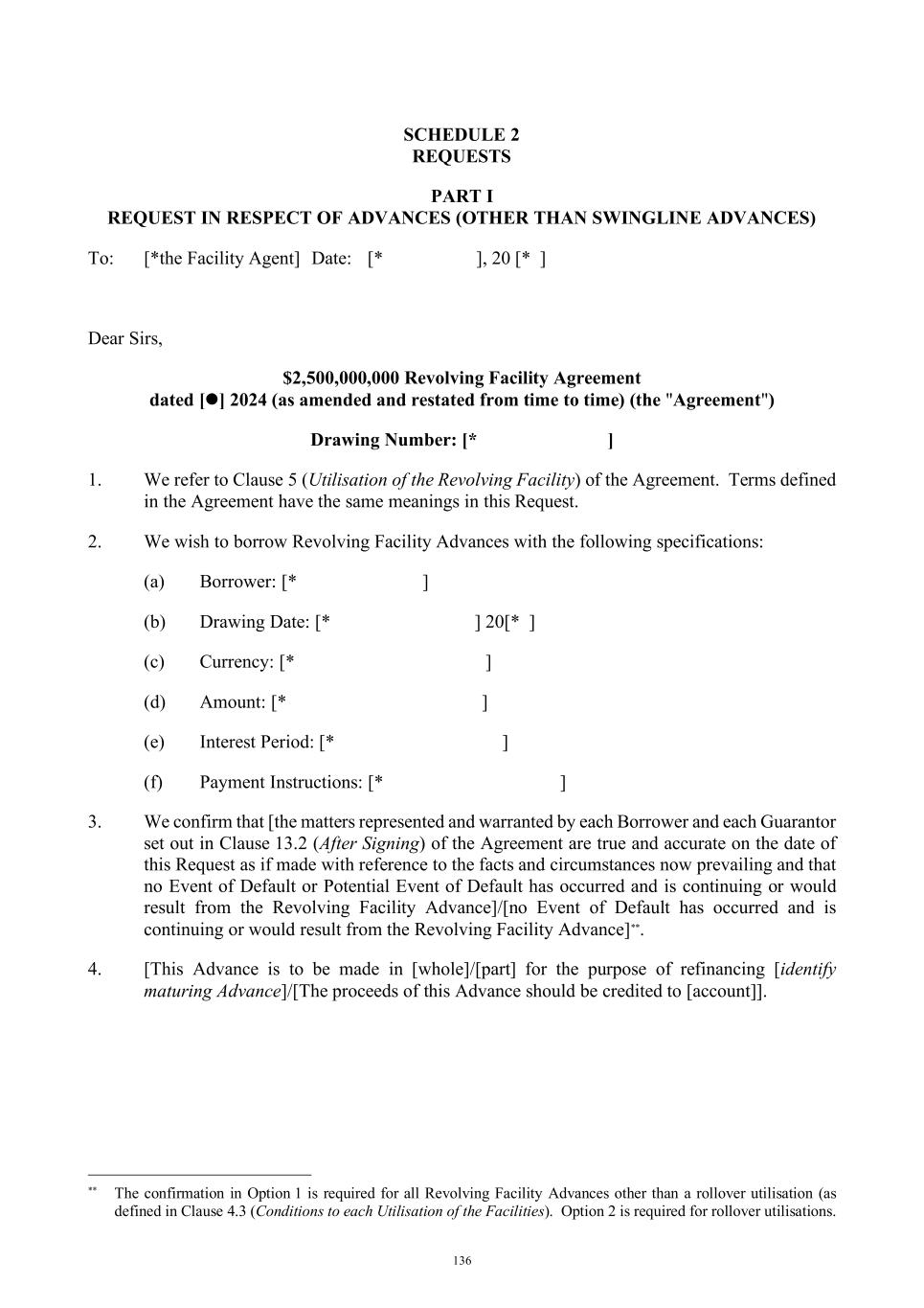 136 SCHEDULE 2 REQUESTS PART I REQUEST IN RESPECT OF ADVANCES (OTHER THAN SWINGLINE ADVANCES) To: [*the Facility Agent] Date: [* ], 20 [* ] Dear Sirs, $2,500,000,000 Revolving Facility Agreement dated [] 2024 (as amended and restated from time to time) (the "Agreement") Drawing Number: [* ] 1. We refer to Clause 5 (Utilisation of the Revolving Facility) of the Agreement. Terms defined in the Agreement have the same meanings in this Request. 2. We wish to borrow Revolving Facility Advances with the following specifications: (a) Borrower: [* ] (b) Drawing Date: [* ] 20[* ] (c) Currency: [* ] (d) Amount: [* ] (e) Interest Period: [* ] (f) Payment Instructions: [* ] 3. We confirm that [the matters represented and warranted by each Borrower and each Guarantor set out in Clause 13.2 (After Signing) of the Agreement are true and accurate on the date of this Request as if made with reference to the facts and circumstances now prevailing and that no Event of Default or Potential Event of Default has occurred and is continuing or would result from the Revolving Facility Advance]/[no Event of Default has occurred and is continuing or would result from the Revolving Facility Advance]**. 4. [This Advance is to be made in [whole]/[part] for the purpose of refinancing [identify maturing Advance]/[The proceeds of this Advance should be credited to [account]]. ** The confirmation in Option 1 is required for all Revolving Facility Advances other than a rollover utilisation (as defined in Clause 4.3 (Conditions to each Utilisation of the Facilities). Option 2 is required for rollover utilisations.
