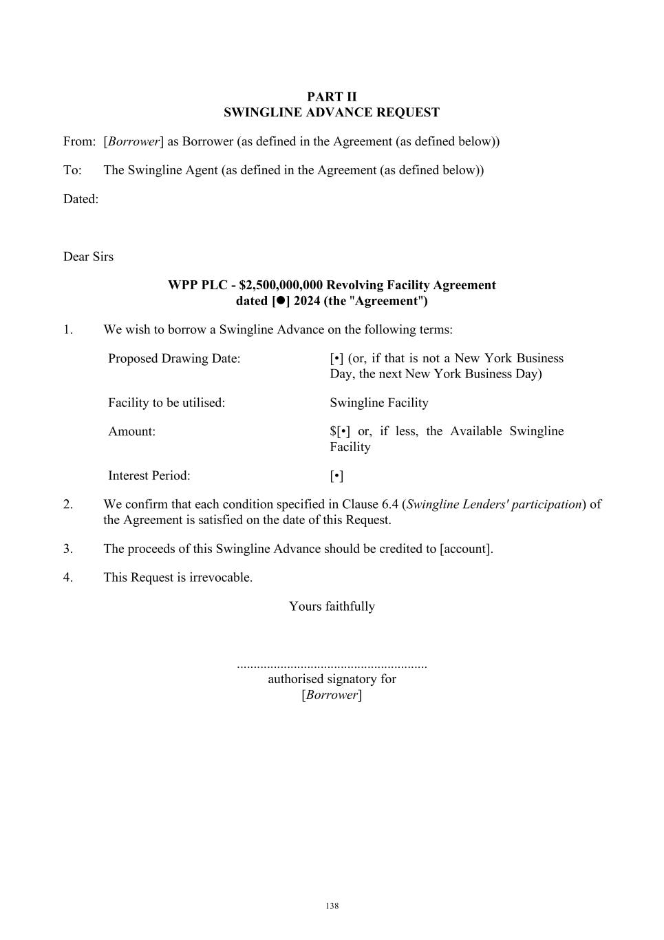 138 PART II SWINGLINE ADVANCE REQUEST From: [Borrower] as Borrower (as defined in the Agreement (as defined below)) To: The Swingline Agent (as defined in the Agreement (as defined below)) Dated: Dear Sirs WPP PLC - $2,500,000,000 Revolving Facility Agreement dated [] 2024 (the "Agreement") 1. We wish to borrow a Swingline Advance on the following terms: Proposed Drawing Date: [•] (or, if that is not a New York Business Day, the next New York Business Day) Facility to be utilised: Swingline Facility Amount: $[•] or, if less, the Available Swingline Facility Interest Period: [•] 2. We confirm that each condition specified in Clause 6.4 (Swingline Lenders' participation) of the Agreement is satisfied on the date of this Request. 3. The proceeds of this Swingline Advance should be credited to [account]. 4. This Request is irrevocable. Yours faithfully ......................................................... authorised signatory for [Borrower]