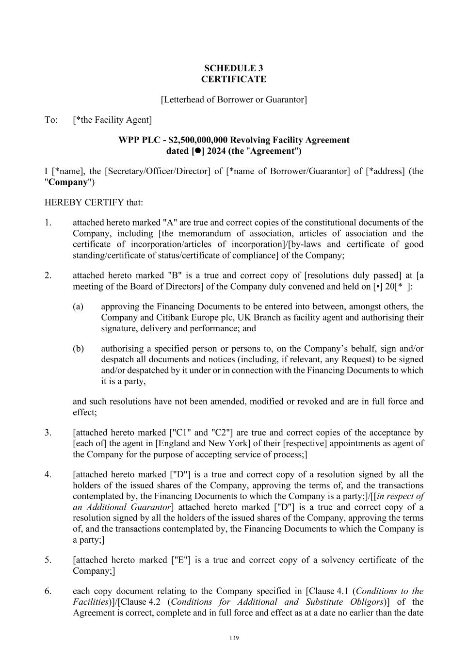 139 SCHEDULE 3 CERTIFICATE [Letterhead of Borrower or Guarantor] To: [*the Facility Agent] WPP PLC - $2,500,000,000 Revolving Facility Agreement dated [] 2024 (the "Agreement") I [*name], the [Secretary/Officer/Director] of [*name of Borrower/Guarantor] of [*address] (the "Company") HEREBY CERTIFY that: 1. attached hereto marked "A" are true and correct copies of the constitutional documents of the Company, including [the memorandum of association, articles of association and the certificate of incorporation/articles of incorporation]/[by-laws and certificate of good standing/certificate of status/certificate of compliance] of the Company; 2. attached hereto marked "B" is a true and correct copy of [resolutions duly passed] at [a meeting of the Board of Directors] of the Company duly convened and held on [•] 20[* ]: (a) approving the Financing Documents to be entered into between, amongst others, the Company and Citibank Europe plc, UK Branch as facility agent and authorising their signature, delivery and performance; and (b) authorising a specified person or persons to, on the Company’s behalf, sign and/or despatch all documents and notices (including, if relevant, any Request) to be signed and/or despatched by it under or in connection with the Financing Documents to which it is a party, and such resolutions have not been amended, modified or revoked and are in full force and effect; 3. [attached hereto marked ["C1" and "C2"] are true and correct copies of the acceptance by [each of] the agent in [England and New York] of their [respective] appointments as agent of the Company for the purpose of accepting service of process;] 4. [attached hereto marked ["D"] is a true and correct copy of a resolution signed by all the holders of the issued shares of the Company, approving the terms of, and the transactions contemplated by, the Financing Documents to which the Company is a party;]/[[in respect of an Additional Guarantor] attached hereto marked ["D"] is a true and correct copy of a resolution signed by all the holders of the issued shares of the Company, approving the terms of, and the transactions contemplated by, the Financing Documents to which the Company is a party;] 5. [attached hereto marked ["E"] is a true and correct copy of a solvency certificate of the Company;] 6. each copy document relating to the Company specified in [Clause 4.1 (Conditions to the Facilities)]/[Clause 4.2 (Conditions for Additional and Substitute Obligors)] of the Agreement is correct, complete and in full force and effect as at a date no earlier than the date