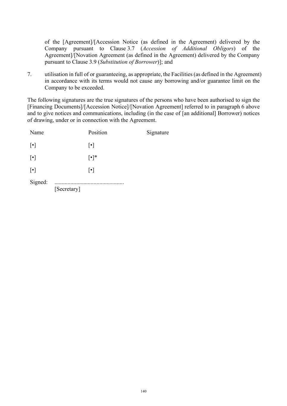 140 of the [Agreement]/[Accession Notice (as defined in the Agreement) delivered by the Company pursuant to Clause 3.7 (Accession of Additional Obligors) of the Agreement]/[Novation Agreement (as defined in the Agreement) delivered by the Company pursuant to Clause 3.9 (Substitution of Borrower)]; and 7. utilisation in full of or guaranteeing, as appropriate, the Facilities (as defined in the Agreement) in accordance with its terms would not cause any borrowing and/or guarantee limit on the Company to be exceeded. The following signatures are the true signatures of the persons who have been authorised to sign the [Financing Documents]/[Accession Notice]/[Novation Agreement] referred to in paragraph 6 above and to give notices and communications, including (in the case of [an additional] Borrower) notices of drawing, under or in connection with the Agreement. Name Position Signature [•] [•] [•] [•]* [•] [•] Signed: ................................................ [Secretary]