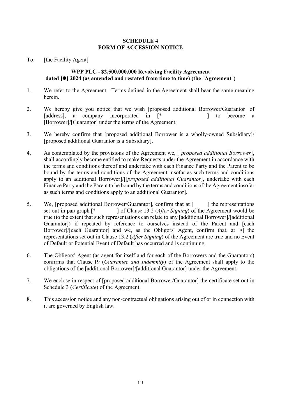 141 SCHEDULE 4 FORM OF ACCESSION NOTICE To: [the Facility Agent] WPP PLC - $2,500,000,000 Revolving Facility Agreement dated [] 2024 (as amended and restated from time to time) (the "Agreement") 1. We refer to the Agreement. Terms defined in the Agreement shall bear the same meaning herein. 2. We hereby give you notice that we wish [proposed additional Borrower/Guarantor] of [address], a company incorporated in [* ] to become a [Borrower]/[Guarantor] under the terms of the Agreement. 3. We hereby confirm that [proposed additional Borrower is a wholly-owned Subsidiary]/ [proposed additional Guarantor is a Subsidiary]. 4. As contemplated by the provisions of the Agreement we, [[proposed additional Borrower], shall accordingly become entitled to make Requests under the Agreement in accordance with the terms and conditions thereof and undertake with each Finance Party and the Parent to be bound by the terms and conditions of the Agreement insofar as such terms and conditions apply to an additional Borrower]/[[proposed additional Guarantor], undertake with each Finance Party and the Parent to be bound by the terms and conditions of the Agreement insofar as such terms and conditions apply to an additional Guarantor]. 5. We, [proposed additional Borrower/Guarantor], confirm that at [ ] the representations set out in paragraph [* ] of Clause 13.2 (After Signing) of the Agreement would be true (to the extent that such representations can relate to any [additional Borrower]/[additional Guarantor]) if repeated by reference to ourselves instead of the Parent and [each Borrower]/[each Guarantor] and we, as the Obligors' Agent, confirm that, at [•] the representations set out in Clause 13.2 (After Signing) of the Agreement are true and no Event of Default or Potential Event of Default has occurred and is continuing. 6. The Obligors' Agent (as agent for itself and for each of the Borrowers and the Guarantors) confirms that Clause 19 (Guarantee and Indemnity) of the Agreement shall apply to the obligations of the [additional Borrower]/[additional Guarantor] under the Agreement. 7. We enclose in respect of [proposed additional Borrower/Guarantor] the certificate set out in Schedule 3 (Certificate) of the Agreement. 8. This accession notice and any non-contractual obligations arising out of or in connection with it are governed by English law.